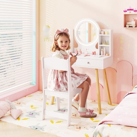 Featuring a captivating mirror with 2 light color settings, this kids vanity set fills every imaginary play session with an air of realism. Keep your little princess’ kingdom of beauty neat and cute with a large tabletop, 6 open shelves and 2 generous drawers, perfect for organizing toy makeup and accessories. Crafted with care, the vanity table and chair set ensures safety with rounded corners, a child-safe PVC mirror, along with sturdy pine wood legs and anti-toppling devices for a stable footing without wobbling or tipping over. Create the perfect make up corner for girls aged 3 and up, where they can explore the basics of grooming while having fun! Bullet Point: 2-Color Lighted Mirror: With its charming front-lit mirror, our kids' vanity set creates an immersive lighting for daily styling and imaginative play. A quick press changes the light from a soft, warm glow to a bright white, setting the stage for endless creative scenarios. Note: Requires 3 AA batteries (not included). Tidy Play Area: The large tabletop of our dressing table provides ample space for little girls to play and unleash their creativity. Plus, the 6 open storage shelves and 2 deep drawers are ideal for your princess’s toy makeups, making it a breeze to find her favorite trinkets and keep play area pristine. Safe for Active Play: Designed with safety in mind, our princess dressing table and chair set complies to EN71 and CPSIA standards. Its corners are carefully rounded to prevent accidental bumps, and the mirror is made from child-safe PVC, keeping the risk of glass breakage at bay. Enhanced Reliability: The kids’ vanity set stands on 4 sturdy solid pine wood legs, and comes with anti-toppling devices to anchor it to walls for safe pretend play sessions. Plus, the kid-sized chair is designed to hold up to 75 kg, providing a safe and ergonomic seat for toddlers, kids and teenage girls. Perfect for Your Princess: A graceful addition to any playroom or kids’ bedroom, our kids’ vanity makes a fantastic birthday or Christmas gift for girls aged 3 and above. Please check the measurements to ensure a perfect fit: the table measures 70 cm x 34 cm x 106 cm (L x W x H), and the chair measures 35 cm x 31 cm x 65 cm (L x W x H). Specifications: Colour: White Material: MDF + Pine Wood + PVC Mirror Table Dimension: 70 cm x 34 cm x 106 cm (L x W x H) Chair Dimension: 35 cm x 31 cm x 65 cm (L x W x H) Seat Dimension: 28.5 cm x 28 cm x 31.5 cm (L x W x H) Mirror Diameter: 26 cm Weight Capacity of Tabletop: 50 kg Weight Capacity of Chair: 75 kg Suitable Age: 3+ years old Net Weight: 14 kg Package includes: 1 x Vanity Table 1 x Chair 1 x User Guide Box Qty:1(May vary by batch)