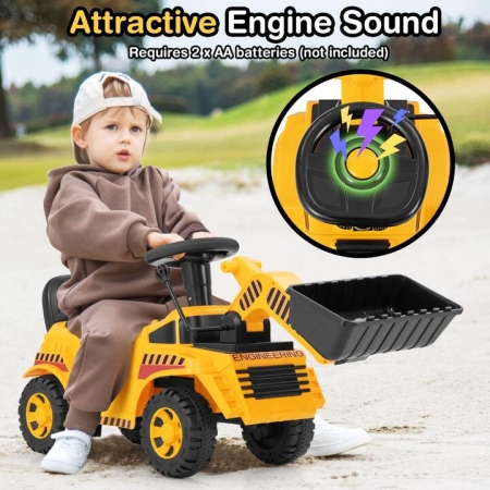 Young operators will love the foot to floor ride on bulldozer, the ultimate construction playmate, featuring 2 levers for easy control and more entertainment. The excavator digger toy has an adjustable bucket for sand or for soil. An interactive steering wheel adds realistic engine sound for an immersive experience. The under-seat storage is designed for blocks, dolls, snacks, drinks, books, and more. The construction vehicle also comes with treaded wheels for stability on the asphalt road, wood floor, cement floor, etc. The backrest and anti-tipping block will promote the stability. The sit scoot design encourages physical activity, balance, and coordination. More kid-friendly details await your discovery. BulletPoint: Simple Manual Operation: Ideal for kids aged 19-36 months, the ride on bulldozer boasts 2 levers that enable kids to easily control the arm and bucket. The car ensures enjoyable handling while digging in sand or soil. Interactive Steering Wheel: The ride on excavator features a steering wheel for easy direction control. The car also provides realistic engine sound, turning any play area into a bustling construction site. Please note that 2 x AA batteries are required but not included. Spacious Under-Seat Storage: The 91 x 30 x 42 cm (L x W x H) excavator digger boasts a storage compartment that is perfect for encouraging little ones to take responsibility to manage their treasures, such as snacks, books, toys, etc. Optimal Stability: Made of premium PP, the ASTM compliant and CPSIA certificated ride on digger is sturdy, while its supportive backrest and anti-tipping base promote the stability. Thanks to puncture-proof wheels, the car can conquer various roads. Beneficial Gift for Children: The foot to floor ride on car encourages physical activity and helps in developing balance and coordination. Kids can immerse themselves in exciting role-playing games, aided by the realistic appearance of the toy car. Features: Middle handle to control the arm and side lever to control the bucket Attractive engine sound requires 2 x AA batteries (not included) Comes with 4 treaded wheels for rubber road, wood floor, cement floor, etc Additional storage space makes it easy to carry children's play essentials in style Designed with a reliable backrest that promotes sitting stability Spacious seat provides reliable support and promotes the comfort Comes with an anti-tipping block that ensures great stability Good for physical development, balance training, body coordination, and more Interesting ride on push car for indoor and outdoor playtime ASTM compliant and CPSIA certificated for ensured quality Specifications: Color: Yellow & Black Material: PP Overall Dimensions: 91 x 30 x 42 cm (L x W x H) Size of Seat: 23 x 17 cm (L x W) Height of Seat: 25 cm Diameter of Wheels: 15 cm Load Capacity of Seat: 15 kg Suitable Age: 19-36 Months Net Weight: 3.5 kg Package Includes: 1 x Ride on Bulldozer 1 x User Guide Box Qty:1(May vary by batch)