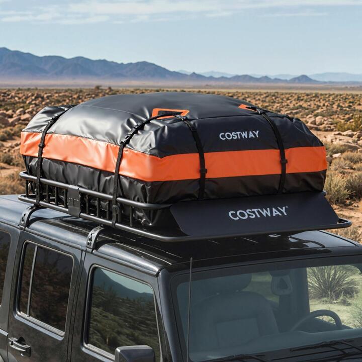 The cargo roof rack starts with a powder-coated metal frame that shoulders up to 90 kg while an aerodynamic fairing reduces wind noise and trims fuel consumption across every mile. A 425 L fortress of 500D PVC arrives as the matching bag, its widened rain curtain, hook-and-loop seal, and waterproof double zippers keeping sleeping bags and camera lenses bone-dry when monsoons strike. You can run sleek with just the basket, go minimalist with only the bag, or combine both for maximum hauling muscle on family road trips or cross-country moves. 2 pairs of ratchet straps, 4 door hooks, a lock, and buckle straps further enhance the firm placement of the cargo carrier. Bullet Point:Heavy-Duty Metal Basket: With 90 kg max load, the reinforced cargo carrier cargo basket ensures reliable strength and durability. The basket is also designed with an aerodynamic wind fairing for noise reduction and less fuel consumption.All-Weather Cargo Bag: Made from all-weather 500D PVC, the cargo bag is rainproof, sunproof and snowproof. The widened rain curtain combined with hook and loop fasteners and waterproof double zippers provides sealed and secured storage space inside the bag.Fit Multiple Roof Racks: 4 universal U-bolts with flexible adjustment secure the carrier basket to SUVs, trucks, and sedans with existing cross bars. Note: Not compatible with round-shape cross bar. Maximum distance of crossbars: 99 cm.Large Capacity & Multiple Uses: Offering 425 L of storage space, the cargo bag is ideal for carrying large loads. The cargo basket and bag set can be used in 3 different ways: only basket, only bag (please use door hooks if the vehicle has no roof racks), or both together. This flexibility adapts to different travel and storage needs.Secure Straps & Lock System: Whether for bumping, sloping, curved rod or high speed, firm placement of your cargo is ensured by 2 pairs of ratchet straps and 4 door hooks. The buckle straps on the bag and an additional lock included keep everything tightly secured. Specification:Color: Black + OrangeMaterial: Metal, PVCDimension of Basket: 130 x 91 x 17 cm (L x W x H)Capacity of Cargo Bag: 425 LWeight Capacity of Basket: 90 kgNet Weight: 17 kgBox QTY: 1(May vary by batch)Is Assembly Required: Yes Package includes:1 x Roof Carrier Basket1 x Cargo Bag2 x Pairs of Ratchet Straps4 x Door Hooks1 x Storage Bag1 x Lock1 x Instruction