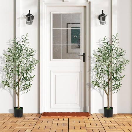 Our 130 cm tall artificial olive plant set includes 2 trees, which are the perfect decorations for various occasions, such as homes, offices, balconies, porches, stores, and more, adding vitality and elegance to your living space. Featuring verdant leaves and vibrant olive fruits, complemented with simulated PE trunks and realistic moss, these trees create a visually striking and authentic botanical display that will impress any guest. Besides, it adopts selected polyester leaves, which are not only long-lasting but also free from any unpleasant odors, allowing you to enjoy the beauty of greenery without the usual upkeep. The included sturdy cement pot provides stability and prevents accidental toppling, giving you peace of mind, especially in households with children or pets. Bring a fresh and graceful vibe to your home! Bullet Points: Lifelike Appearance: This 130 cm tall artificial olive tree features full-bodied leaves with verdant colors and vivid olive fruits, which is designed to replicate the natural beauty of real olive trees. Additionally, there is realistic moss covered on the flowerpot, adding authenticity to the whole look. Free Maintenance: In contrast to the real plant that is easy to wither or fade, this artificial plant would not be affected by seasons while keeping vitality all the time. Also, it requires no watering, fertilizer, sunlight, or pruning. Premium Material: The leaves are crafted of selected polyester fabric, which is not only crack-resistant and reliable but also non-odor and non-allergic for safe use. Besides, there are wires inside the branches, allowing for easy shaping. Stable and Sturdy Structure: The faux olive tree features a stable flowerpot with built-in cement, ensuring good stability and sturdiness while preventing children or pets from knocking it down easily. For added aesthetic appeal, you can also easily transfer it to a more attractive pot of your choice. Versatile Decoration: The package includes 2 fake potted plants, which are perfect for adding a serene and natural touch to multiple indoor settings such as living rooms, hallways, offices, or even event venues like weddings and corporate functions. Warm Tips: Please carefully bend the branches outward to get a fluffy shape. Features: Adopts full-bodied leaves with verdant colors and highly realistic textures Adopts vivid olive fruits, add a touch of freshness and charm The simulated PE trunks add a touch of natural charm and texture The realistic moss adds authenticity to the whole look Equipped with a solid cement pot , prevent wobbling or tipping over Adopts selected polyester leaves, odorless, safe, and built to last No maintenance required, keep evergreen, maintain its beauty over time Ideal for decorating your home, office, wedding, front door porch, balcony, patio, etc Features adjustable branches with wires inside, adjust the shape for a fuller look Specifications: Color: Green + White Material: Polyester Fabric, PE, PP, Wire, Foam, Cement Tree Height: 130 cm Pot Size: 15 x 12.5 cm (Dia. x H) Net Weight: 5 kg Box QTY: 1 Package Includes: 2 x Artificial Olive Trees