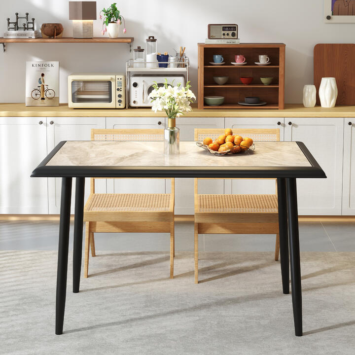 Our sintered stone dining table measures 110 x 70 x 75 cm (L x W x H), seamlessly blends into your dining room, kitchen, or any indoor space, offering ample room without crowding the area. The tabletop is crafted from premium sintered stone that withstands high temperatures up to 2300 °F/1300 °C, allowing you to place hot dishes directly onto the surface without a care. Moreover, the tabletop surface is smooth and scratch-resistant, making it easy to clean stains with a damp cloth. The robust metal frame, complete with reinforced triangular structures, providing a reliable and stable foundation, not easy to wobble. Adorned with a sleek black frame and sophisticated gray marble-like finish, this table not only adds a touch of sophistication to your space but also elevates the aesthetic appeal of any room. Bullet Points:Versatile Use: This rectangular dining table measures 110 x 70 x 75 cm (L x W x H), which fits beautifully in various indoor settings such as dining rooms, kitchens, or small apartments. It is ideal for family meals, study sessions, or gatherings with friends. Premium Sintered Stone Tabletop: Crafted from high-quality sintered stone with a melting point of 2300 °F/1300 °C, this tabletop offers exceptional heat resistance, without the hassle of using heat pads. Moreover, it is tough enough to withstand daily wear and tear, ensuring long-lasting performance. Easy to Maintain: The tabletop surface is smooth and scratch-resistant, making cleaning a breeze. It is also food-grade, allowing you to place food directly on the tabletop, providing convenience for meal prep and dining. Stable and Reliable Construction: Built with 38 mm robust metal tubes and reinforced triangular structures, the kitchen table ensures a strong loading capacity of 60 kg, offering a secure and reliable dining experience. Additionally, there are anti-slip footpads for floor protection. Modern Yet Timeless Aesthetic: The table features a sophisticated blend of a sleek sintered stone surface with an elegant black metal frame, adding a touch of luxury to any space. Additionally, with its simple structure and clear illustrations in the user’s manual, it is easy to set up. Specifications:Colour: Grey+BlackMaterial: Sintered Stone, MetalProduct Dimensions: 110 x 70 x 75 cm (L x W x H)Weight Capacity: 60 kgNet Weight: 22 kg Package Includes:1 x Sintered Stone Dining Table1 x User’s Manual Box QTY: 1(May vary by batch)