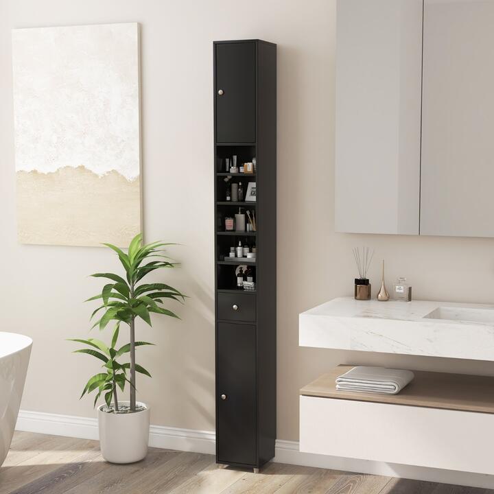 This tall storage cabinet will be a great storage solution for small rooms! This tall storage cabinet features a small footprint but large storage capacity including 2 cabinets, 5 compartments and 1 drawer, which makes it perfect for small rooms or corners in your house to create additional storage space. Plus, 5 adjustable shelves are providing you with customizable storage space to meet different storage needs. Made of high-quality MDF material, this bathroom storage cabinet has a durable and strong structure. And users can fix this organizer to the wall with included anti-toppling device, which is safer for the family with kids and pets. Bullet Point: Perfect Space Saver for Small Rooms: This tall and slim storage organizer utilizes every inch in your room to create additional storage space while eating up a small floor area. It will be a perfect addition to any corner of your room. Product dimensions: 20 cm x 20 cm x 180 cm (L x W x H). Ample Storage Space: This freestanding floor cabinet is equipped with 2 storage cabinets, 5 storage compartments and 1 drawer to offer roomy storage space for various items, such as cosmetics, makeup tools, towels, toilet paper, decorations and more. Customize Your Desired Storage Space: This bathroom organizer is designed with 5 adjustable shelves, including 3 3-level adjustable shelves and 2 8-level adjustable shelves. So, you can freely adjust the shelves to accommodate items with different heights. Total weight capacity: 50 kg. Anti-Toppling Device & Premium Hardware: Coming with an anti-toppling device, users can fix this tall cabinet to the wall for extra safety and stability. The cabinets and drawer use round door knobs and the cabinets are equipped with magnetic catches. Simple Style & Easy Matching: Designed in a simple but elegant style, this narrow bathroom storage cabinet fits in easily with your existing decorations, suitable for the bathroom, living room, kitchen, etc. The elevated bottom design keeps the cabinet away from water. Features: Slim stature eats up limited floor area, suitable for small rooms Offers large storage capacity with 2 cabinets, 5 compartments and 1 drawer Features 5 adjustable shelves for customizable storage space Comes with an anti-toppling device for extra safety Elevated bottom design with rubber foot pads Equipped with metal door knobs and magnetic catches Simple appearance matches most decoration styles Specifications: Colour: White Material: MDF Overall Dimension: 20 cm x 20 cm x 180 cm (L x W x H) Total Weight Capacity: 50 kg Net Weight: 12.5 kg Package Includes: 1 x Bathroom Cabinet 1 x User Guide Box Qty: 1(May vary by batch)