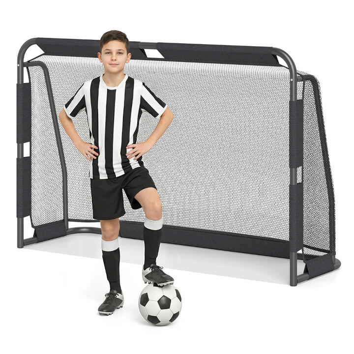 The sturdy metal frame resists bending and promises lasting performance, making it an excellent choice for backyard matches or playground games. 2 extra leg pegs drive securely into the soil, while ground stakes add additional anchoring, ensuring the goal system remains stable during energetic kicks and saves. The high-quality knotless PE net is both resilient and gentle, offering long-term use with enhanced safety. Tear-resistant oxford cloth sides withstand rigorous play, and the net attaches easily with hook and loop fasteners for convenient assembly. Perfect for yard, playground, or park sessions, the football goal set transforms any space into a field for budding athletes. Bullet Point: Stable Heavy-duty Metal Frame: Engineered with a metal construction and an A-frame design, the soccer goal for backyard is built to offer outstanding stability and longevity. The anchoring kit features 2 ground stakes and a 2 leg pegs, which secure the goal post firmly into the ground to prevent tipping during use. High-strength PE Netting: Constructed from safe knot-free PE mesh, the goal net offers superior strength, resilience, and lasting performance against powerful shots. Additional durability comes from the reinforced oxford fabric borders, which provide exceptional resistance to tearing. Simple Tool-free Assembly: Assembly is hassle-free thanks to easy-to-follow instructions. Every component is clearly labeled for seamless, secure attachment, eliminating the need for extra tools or complicated procedures. Please assemble the frame according to the serial number marked. Encourage Active Play & Development: Measuring 182 x 60.5 x 120 cm (L x W x H), the football goal set is ideally sized for children and youths. It serves as an excellent platform to foster teamwork, enhance agility, and support physical fitness in young players. Multi-scene Application: Shaped in a classic rectangle, the kids soccer goal replicates the look and feel of regulation goals, making it perfect for authentic training and games. Suitable for backyards, parks, and school fields, it adapts effortlessly to a range of environments and activities. Specification: Color:Black Material: Metal, PE Net, Oxford Fabric ProductDimensions:182 x 60.5 x 120 cm (L x W x H) NetWeight:9.5 kg Is Assembly Required: Yes Box Qty: 1 (May vary by batch)