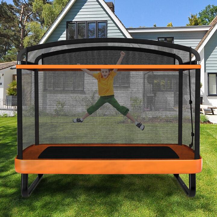 Enjoy a carefree childhood outdoors with this kid's trampoline! Combining trampoline and swing as one, this kids toy set offers a choice for your child to jump or swing. If your kid wants to jump, the high-density jumping cloth with 40 premium springs provides an excellent bouncing experience. And the U-shaped galvanized steel frame is sturdy enough to support your child (100 kg for trampoline and 50 kg for swing). Meanwhile, the soft foam cushion and upper pipes with foam-padded keep your kid safe. Bullet Point: 2 In 1 Trampoline: Vary from other traditional trampolines, this kids trampoline is designed with a swing. Therefore, this high-quality trampoline not only allows your child to jump but also lets your kid swing freely so that this kid's toy will attract your little one for a long time. High Elasticity: Featuring 40 galvanized springs and a high-density jumping cloth, this premium trampoline offers your kid an ultimate bouncing experience. He/she will enjoy playing in it and release endless energy to fall asleep fast in the evening. Meanwhile, bouncing helps bone growth. Sturdy Structure: Constructed of sturdy 2 U-shaped galvanized steel frames, this safe trampoline is anti-rust for outdoor use and stable for safety. Moreover, it comes with a strong loading capacity for different zones (100 kg for trampoline and 50 kg for swing). Safety First: We always keep your child's safety in mind. The soft foam cushion covers all the springs so that it prevents your kid’s hands or feet from being caught in the gap. Moreover, the upper pipes are padded with soft foam as well, ensuring your child’s safety. Considerate Design: With the appropriate height from the ground ( 41 cm ) and zipper with double buckles is convenient for your little one to get in and out. And the enclosure net adds extra safety for your child. Features: Safe to use with ASTM certification Promotes bone growth with bouncing Trampoline and swing set for endless fun Safety enclosure net for perfect protection Upper pipes with foam padded for extra safety U-shaped galvanized steel frame for strong stability Holds up to 100 kg for trampoline and 50 kg for swing Avoids accidental injury thanks to its soft foam cushion covers on the springs Easy to get in and out with appropriate height and zipper with double buckles Offers perfect bouncing experience with high-density jumping cloth and 40 springs Specifications: Color: Black and orange Material: Galvanized steel, PP, PVC, EPE, PE ProductDimensions:190 x 124.5 x 161 cm (L x W x H) Net weight:31 kg Weight capacity of trampoline: 100 kg Weight capacity of swing: 50 kg Recommended age: Over 3 years old Package Includes: 1 x Trampoline 1 x Swing 40 x Springs 1 x Instruction Box Qty:1(May vary by batch)