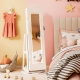 The clear full-length mirror brings your little one a head-to-toe view, while the handy built-in mirror allows kids to try on jewelry. The jewelry cabinet offers multiple shelves, hooks, and slots, which is perfect for storing necklaces, bracelets, earrings, and more. The swivel function brings much convenience. Additionally, soft LED lights brighten up the inside, making it easy to find kid's favorite accessories. The crown pattern and bright lights create a whimsical look that kids will love. To keep it safe and sturdy, the standing jewelry cabinet also has an anti-toppling device and solid base. Furthermore, it is CPSIA compliant for higher safety. Bullet Point:3-in-1 Functional Design: The kids jewelry organizer perfectly combines the full-length mirror, jewelry cabinet, and storage rack, allowing kids to enjoy dress-up fun. The full-length mirror enables kids to see their outfits from head to toe, while the built-in makeup mirror helps kids enjoy making up and select jewelry.Light Strip & 4 Sensor Lights: The full-length mirror has 3-color light (warm yellow, warm white, cool white). Your child can adjust the light color through the touch control. Plus, the 4 sensor lights will automatically turn on when kids open the jewelry armoire,offering optimal lighting for kids to make up or reach for their jewelry.360° Swivel & Split Function: Thanks to the swivel and split function, the jewelry cabinet allows kids to find the optimal angle for dressing up. Your little one can check their look from multiple angles without moving.Abundant Storage Space: The jewelry storage cabinet features 27 earring slots, 6 necklace hooks, 64 ring slots, 3 bracelet rods, and 3 storage shelves to all the jewelry and cosmetics. Moreover, 1 foldable fabric drawer and 2 rear storage shelves provide added storage space for kid's clothes, books, toys, etc.Secure & Stable Construction: Magnetic catches and lockable door keep the door tightly closed. The soft lining protects the inside jewelry. The solid base and anti-toppling design keep it steady and prevent tipping over. More importantly, it complies with CPSIA. Specification:Color: Pink/WhiteMaterial: MDF, Glass, AcrylicProduct Dimensions: 30.5 cm x 30 cm x 120 cm (L x W x H)Full-length Mirror Dimensions: 64 cm x 18 cm (L x W)Interior Mirror Dimensions: 24.5 cm x 15.5 cm (L x W)Net Weight: 10 kgBox QTY: 1(May vary by batch)Is Assembly Required: Yes Package Includes:1 x Kids Jewelry Cabinet1 x Instruction