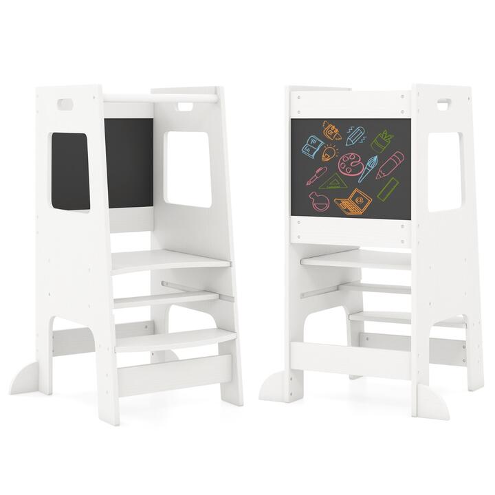 The 2-level adjustable platform ensures your little one can safely reach countertops and sinks, engaging comfortably in various activities. The integrated chalkboards encourage artistic expression and educational activities. Crafted with solid wood and safety features, this step stool includes anti-fall rail and rounded edges. Beyond a step tool, it doubles as an activity center, promoting independence and learning in different environments. Bullet Point:Adjustable Platform: Featuring a 2-level adjustable platform, this wooden toddler kitchen step stool caters to the needs of your growing child, ensuring your child safely reaches countertops, sinks, and engages comfortably in various activities around the home. Engaging Chalkboards: This kids standing tower with chalkboards turns learning and creativity into part of everyday tasks. Ideal for jotting down recipes, drawing, or educational games, it keeps your child engaged and entertained while helping out in the kitchen. Solid Wood Construction: Designed with your child's safety in mind, this step stool includes a stable A-shaped structure crafted with an anti-falling safety rail, smooth rounded edges and anti-tip feet. Easy to Move: Despite its robust design, this step stool is easy to handle and relocate thanks to easy-to-grip handles. The standing tower can be moved effortlessly around the kitchen or any other room. Versatile Usage: More than just a step tool, this multi-use wooden structure doubles as an activity center for your little one. Whether it's helping out in the kitchen or engaging in creative play, this step stool fosters independence and learning in multiple environments. Specifications:Colour: Natural/WhiteMaterial: Birch Wood + PlywoodOverall Dimension: 60 cm x 49 cm x 91.5 cm (L x W x H)Chalkboard Dimension: 39 cm x 28 cmHeight from Floor to Platform: 30 cm, 40 cmSuitable Age: 1+ years oldWeight Capacity: 60 kgNet Weight: 8 kg Package Includes:1 x Kitchen Step Stool1 x Instruction Manual Box Qty:1(May vary by batch)