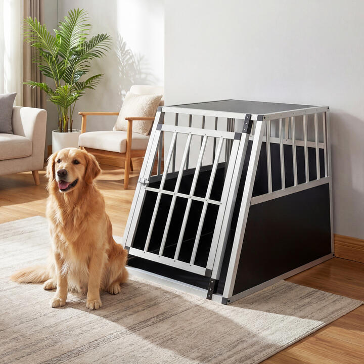 Featuring a compact trapezoidal silhouette, the dog travel crate is designed to fit seamlessly in most car models, such as RVs, pickup trucks and SUVs, making it effortless to bring your pet along on family outings, road trips, or vet appointments. Constructed from chew-resistant aluminum alloy with reinforced plastic corners, the heavy-duty pet carrier offers exceptional rust resistance and stands up to determined chewers, ensuring years of reliable use. Safety doors with locking system can open at a wide 100-degree angle, giving you quick, safe access to your pet and minimizing the risk of scratches to your vehicle during loading and unloading. Plus, ample mesh paneling provides outstanding ventilation and panoramic visibility, keeping your dog comfortable and at ease while safeguarding paws and noses from harm. Bullet Point: Chew-proof Aluminum Frame: Built from premium aluminum alloy with reinforced plastic corners, the travel dog crate boasts unbeatable rust resistance and sturdiness. Furthermore, the thickened pipes are resistant to deformation and chewing for long-lasting performance. Secure Lockable Door: With a lockable door system, the dog cage ensures your furry friend is always secure. Additionally, thanks to the thoughtful 100-degree door opening angle, you can load or unload your pet quickly without risking scratches to your car's paintwork. Excellent Airflow & Visibility: Featuring mesh windows, the car transport dog crate delivers excellent ventilation and soothing panoramic views, helping your dog stay calm and cool. Furthermore, the wide gaps of the mesh windows will prevent claws from getting stuck during travel. Wide Range of Application: Whether you're heading out for a family road trip, camping adventure, or a vet visit, this dog transport box is purpose-built with a compact trapezoidal design that effortlessly fits inside almost any car trucks, making pet mobility stress-free. Perfect Fit Guidance: The inner size of the travel dog crate is 64 x 51 x 48 cm/86 x 61.5 x 65 cm(L x W x H), which is recommended for small dogs or cats/small and medium sized dogs. For a snug fit, please measure the height from floor to dog's ears while it sitting and then measure the length from dog's nose to tail while it standing up. Specification: Color: Silver & Black Material: Solid Plywood, Aluminum Alloy Type A: Product Dimensions: 69.5 cm x 54 cm x 50.5 cm(L x W x H) Tabletop Size: 46 x 45 cm(L x W) Interior Size: 64 x 51 x 48 cm(L x W x H) Door Height: 38.5 cm Side Window Height: 23 cm Net Weight: 8.5 kg Type B: Product Dimensions: 91 cm x 65 cm x 69.5 cm(L x W x H) Tabletop Size: 59 x 53.5 cm(L x W) Interior Size: 86 x 61.5 x 65 cm(L x W x H) Door Height: 59 cm Side Window Height: 29.5 cm Net Weight: 11.5 kg Is Assembly Required: Yes Box Qty: 1 (May vary by batch)