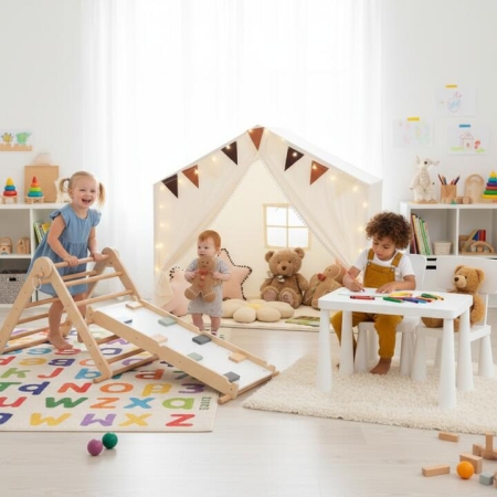 1. Kids Table Set with 2 Chairs (White) A stylish and functional space for reading, drawing, snacks and homework.• Sturdy and easy-to-clean surface• Ergonomic size for toddlers and preschoolers• Helps build focus and independent play Perfect for art projects, reading time or play dates. 2. 3-in-1 Pikler Climbing Triangle with Dual Ramp (Natural) Encourage gross motor skills and active exploration with this versatile climbing set.• Adjustable Pikler triangle grows with your child• Dual-side ramps for climbing, sliding or balance play• Made from safe, smooth natural wood Great for building confidence, strength and coordination — indoors and outdoors. 3. Large Play Tent House with Curtains & Star Lights (Beige) Transform any corner into a cosy playhouse or reading nook.• Spacious design with fabric & screen curtains• Built-in star string lights for magical ambience• Neutral beige fits any décor Ideal for pretend play, storytelling, cosy naps and imaginative adventures. Why This Set Is Perfect for Your Home • All-in-one play environment: Creative table space + active play structure + imaginative tent• Supports development: Fine motor skills, gross motor skills, focus & creativity• Stylish & practical: Neutral colours that fit modern interiors• Long-lasting use: Durable materials designed for growing kids Bring playtime, learning and exploration together — the ultimate set for curious little minds and active bodies! White Chair and Table setMaterial: PPDimension of table: 76.5 x 54.5 x 49.5 cm (L x W x H)Dimension of chair: 38.5 x 36 x 66.5 cm (L x W x H)Net weight: 8.5 kgWeight capacity of table: 50 kgWeight capacity of each chair: 50 kgRecommended age: 1-7 years old Natural Climbing TriangleMaterial: Plywood, Beech WoodOverall Dimension: 115 x 69 x 60 cm (L x W x H)Dimension of Climbing Ramp: 80 x 32 x 7 cm (L x W x Thickness)Dimension of Climbing Triangle: 128/115/73 x 69 x 10/36/60 cm (L x W x H)Folding Dimension of Climbing Triangle: 70 x 69 x 11 cm (L x W x Thickness)Net Weight: 8 kgWeight Capacity: 50 kgRecommended Age: 3+ Years Old Beige Play TentMaterial: Polyester, Cotton, PVCOverall Dimensions: 146 x 96 x 133 cm (L x W x H)Net Weight: 4 kgMaximum Height of Kids: 1.5 mRecommended Number of Users: 3-4 Box Qty:1(May vary by batch)
