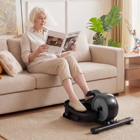Our under desk elliptical seamlessly blends into any workspace or home environment. Its advanced magnetic resistance and smooth trolley system make this leg exerciser ultra silent, letting you work out at under 15 dB without disturbing others. Designed for versatility, its compact size and convenient carry handle ensure the pedal exerciser is easy to store or move between rooms. Protect your knees, ankles, and back with joint-friendly, low-impact cardio that suits every fitness level, from seniors needing gentle exercise to those seeking rehabilitation. With bi-directional motion and an adjustable tension knob, the seated elliptical offers customizable resistance so you can target different muscle groups and keep routines engaging. Keep motivated with real-time stats displayed on the built-in LCD, providing instant feedback on your key workout metrics as you pedal through your day. Joint-Friendly Cardio Exercise: This low-impact and joint-friendly seated elliptical could protect the spine, ankle joint, and reduce knee pressure, which is suitable for all fitness levels and ideal for users with limited mobility. It is an excellent option for elders, knee exercisers, or anyone seeking gentle exercise at home or in the office. Whisper-Quiet Exercise: Thanks to magnetic resistance and a smooth pulley system, this ellipse leg exerciser works at under 15 dB without disturbing your work or environment. Plus, it boasts anti-slip foot pads for floor protection and anti-slip pedals for safety during exercise. Portable Design: Featuring a convenient carrying handle, this under desk pedal exerciser makes it simple to transition from your work desk to the living room. Its compact size, measuring 62 x 43 x 28 cm/24.5" x 17" x 11" (L x W x H), ensures it glides under any desk for easy storage when not in use. Customized Resistance & Motion: Get a personalized fitness experience with the adjustable tension knob of this seated elliptical, offering 8 magnetic resistance levels. Moreover, the bi-directional elliptical motion (forward and reserve) targets different muscle groups and enhances workout variety. Real-Time Data Tracking: The under-desk elliptical comes with a multifunctional LCD display that provides instant feedback on your time, speed, workout distance, and calories burned. Just press the red button to activate scan mode and track all essential metrics in sequence for maximum motivation. Specification: Color: Silver+BlackMaterial: Metal, ABSProduct Dimensions: 62 x 43 x 28 cm(L x W x H)Net Weight: 11.5 kg Box QTY: 1(May vary by batch)Is Assembly Required: Yes Package Includes:1 x Under Desk Elliptical1 x User’s Manual
