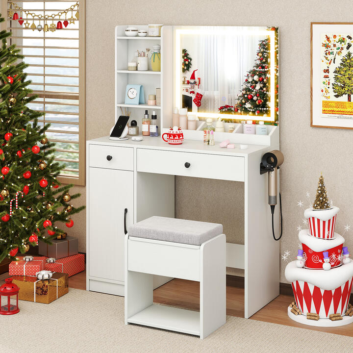 You can customize your lighting with 3 color modes and adjustable brightness. The dressing table features multiple storage options including open compartments, shelves, and drawers. Additionally, the storage stool offers extra hidden storage space. The built-in charging station makes it convenient for hair styling and more within your reach. This minimalist design complements any decoration, which is an ideal gift for your loved ones. Bullet Point: Illuminating LED Mirror: The vanity mirror is equipped with adjustable LED lights featuring 3 color lighting modes (cool white, warm white, warm yellow) and adjustable brightness from 20% to 100%. In addition, the lighting is easy to control through the touch button. Various Storage Options: This dressing table comes with a storage stool, 3 open shelves, 3 makeup trays, a hair dryer rack, a small drawer, a large drawer, and a side cabinet with an adjustable shelf to neatly organize all your beauty essentials. Built-in Charging Station: The charging station includes 2 AC outlets, 1 USB port, and 1 Type-C port, which makes it convenient for hair styling and more. So , you can stay connected and powered up while you prepare. Well-Made Details: Built to last with premium metal drawer slides for smooth operation, and soft close hinges to prevent slamming, this makeup desk set combines durability with luxury. The padded seat cushion provides comfort and elegance, enhancing your daily routine. Minimalist Elegance: This LED makeup table and stool set embodies minimalist design principles, boasting clean lines that fits various decoration styles. It is an ideal choice for your children, loved ones or friends on festivals or anniversaries. Specifications: Color: White Material: Engineered Wood + MDF + Glass Table Dimension: 90 cm x 40 cm x 135 cm (L x W x H) Stool Dimension: 40 cm x 24 cm x 46 cm (L x W x H) Tabletop Height: 68 cm Mirror Dimension: 60 cm x 50 cm Weight Capacity of Tabletop: 55 kg Weight Capacity of Stool: 100 kg AC Outlet: 220-240V/10A USB Port: 5V/3A Type-C Port: 5V/3A Power Cord Length: 1.5 m Net Weight: 24 kg Box QTY: 1(May vary by batch) Package Includes: 1 x Vanity Desk 1 x Stool 1 x User Guide