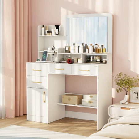 This 100 cm wide vanity desk packs serious storage into its compact frame, keeping everything organized yet within reach. The integrated charging station powers all your tools while the distortion-free mirror ensures flawless application every time. Safety features like anti-toppling devices and non-slip pads make it ideal for busy spaces, while the modern white and gold design elevates any interior design. It is the perfect gift for beauty lover who deserves a little luxury in their daily routine! BulletPoint: Space-saving Vanity Desk: Measuring 100 x 40 x 135 cm (L x W x H), this makeup table is ideal for those who seek a compact setup in smaller bedrooms. It also comes with a clear, distortion-free mirror, making it easy to check your outfit and perfect the details. Sufficient Storage Space: Optimized for daily makeup needs, this vanity desk features 3 open shelves and 3 cubes above its spacious tabletop. Below, you find 4 drawers and a large cabinet, plus an extra storage shelf at leg space, easily accommodating all your beauty essentials. Built-in Charging Station: The vanity features a charging station with 2 AC outlets, 1 USB, and 1 Type-C port, letting you watch beauty videos while charging devices and powering hair styling tools. Besides, its cable management hole helps maintain a neat and organized look on your tabletop. Stable and Secure Design: Equipped with 2 anti-toppling kits, the vanity table secures firmly to the wall for added safety. It also features non-slip foot pads to ensure stability on any surface, along with smooth metal slides for long-lasting use. Surprise Your Loved Ones: Presenting a sleek, modern white finish and elegant golden handles, this dressing table adds a touch of luxury to any space. It makes an ideal gift for your loved ones or a splendid treat for yourself. Specification: Colour: White Material: Engineered Wood, MDF Product Dimensions: 100 x 40 x 135 cm (L x W x H) Mirror Dimensions: 58 x 42.5 cm (L x W) Inner Dimensions of the Cabinet: 28.5 x 37.5 x 30 cm Inner Dimensions of Each Main Drawer: 28 x 33.5 x 7.5 cm (W x D x H) Inner Dimensions of Each Side Drawer: 24 x 33.5 x 10.5 cm (W x D x H) 2 AC Outlets: 240V 15A 1 USB & 1 Type-C Port: 5V 2.1A Power Cord Length: 145 cm Total Weight Capacity: kg Net Weight: 37.5 kg Is Assembly Required: Yes Package Includes: 1 x Vanity Table 1 x Instruction Box Qty: 1(May vary by batch)