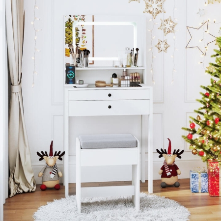 The built-in LED lights surrounding the mirror offer 3 adjustable color modes and you can tailor the brightness to your preference. Simply touch the switch to change the color, and long press to adjust the brightness. This vanity desk features integrated power outlets, allowing you to conveniently plug in beauty tools or devices. The see-through tempered glass desktop offers a modern touch while making it easy to view and access items you need. The open shelf and 2 drawers provide ample storage space for cosmetics, jewelry, and skincare products. Additionally, the inclusion of a cushioned stool offers a cozy seating solution every time you prepare for the day or night out. Bullet Point:Adjustable Lighting Modes: This vanity desk with mirror features 3 lighting modes and adjustable brightness to provide you with perfect illumination. You can easily switch between white, neutral, and warm light to ensure flawless makeup day or night.Small Size, Large Capacity: Measuring 64 x 40 x 132 cm (L x W x H), this compact vanity set fits perfectly into any tight space. The wide desktop and upper open shelf offer quick access to your favorite items. Additionally, 2 large drawers (the shallower one with 6 compartments) keep your cosmetics and accessories organized.Built-in Power Strip: With 2 x AC outlets (240V/15A), 1 x USB port (5V/2.1A ) and 1 x Type-C port (5V/2.1A), you can effortlessly charge your devices and beauty tools right at your makeup station, enjoying a clutter-free area and streamlining your beauty routine.Glass Tabletop & Cozy Stool: This makeup table is equipped with a see-through tempered glass desktop, enabling you to instantly find what you need while adding a touch of modern style to your bedroom. The included soft cushioned stool provides superior comfort and support.Upgraded Stability & Safety: Fitted with 2 anti-toppling devices, this glass top dressing table ensures secure and reliable performance in any living area. Besides, anti-slip foot pads are included for added stability and floor protection. Specification:Color: White/NaturalMaterial: MDF, Engineered Wood, Tempered Glass, Fabric, SpongeVanity Desk Dimensions: 64 cm x 40 cm x 132 cm (L x W x H)Stool Dimensions: 40 cm x 29.5 cm x 48 cm (L x W x H)Mirror Dimensions: 61 cm x 39.5 cm (L x W)Large Drawer Dimensions: 53.5 cm x 29.5 cm x 7 cm (L x W x H)Small Drawer Dimensions: 53.5 cm x 29.5 cm x 5 cm (L x W x H)Tabletop Height: 78 cmPower Cord Length: 145 cmWeight Capacity of Table: 35 kgWeight Capacity of Stool: 75 kgNet Weight: 24 kgBox QTY: 1(May vary by batch)Is Assembly Required: Yes Package Includes:1 x Vanity Table1 x Stool1 x User Guide