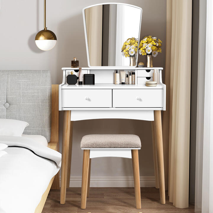 Elevate your beauty routine with our vanity table set with mirror and lights!The lighted mirror allows you to illuminate your space with warm yellow, warm white or cool white lighting options for the perfect ambiance. The ample storage space includes an open shelf and multiple drawers for organized storage. Crafted with solid pine wood legs for elegance and durability, this set is completed with a comfortable, space-saving stool. A stylish and practical gift for loved ones, this modern dressing table adds sophistication to any room while providing a functional and chic solution for daily grooming routines. Bullet Point: 3-Color LED Lighted Mirror: The lighted mirror help light up your makeup routine with 3 color modes – warm yellow, warm white, and cool white. The adjustment is simple with the touch switch – short press to switch the color, long press to adjust the brightness.Spacious Storage Capacity: This dressing table is designed with a compact size yet large capacity. It is equipped with 1 open shelf, 4 small drawers and 2 large drawers to offer different storage options. Table dimension: 69 cm x 40 cm x 132 cm (L x W x H).Elegant & Robust Structure: Crafted with solid pine wood legs, this vanity set not only adds a touch of sophistication to your room but also boasts durability for long-lasting use. The protective foot pads can avoid floor damage. Plus, the included anti-toppling device can prevent tip-over accident.Comfortable Stool Included: The matching upholstered stool perfectly complement the vanity desk. The stool is designed to tuck under the table when not in use, optimizing your space while providing a comfortable seating solution.Stylish & Ideal Gift: This modern and sleek dressing table set is the perfect choice for personal indulgence or as a thoughtful present for your wife, daughter, or friends on special occasions. Its simple design complements any room's decoration. Features: Meets different makeup needs with the 3-color LED lights Large capacity with an open shelf and 6 drawers Includes a comfortable stool with padded seat cushion Made with solid pine wood for durability and sophistication Easy to open the large drawers with round drawer handles Can be fixed to the wall for enhanced safety Simple style matches with various decoration styles Ideal gift for yourself or your loved ones Assembly needed Specifications: Color: White Material: P2 MDF + Pine Wood + Aluminum Mirror Table Dimension: 69 cm x 40 cm x 132 cm (L x W x H) Stool Dimension: 37 cm x 28 cm x 44 cm (L x W x H) Table Height: 76 cm Mirror Dimension: 44 cm x 37 cm Weight Capacity of Tabletop: 50 kg Weight Capacity of Stool: 150 kg Power Cord Length: 1.5 m Net Weight: 20 kg Package includes: 1 x Vanity Table 1 x Stool 1 x User Guide Box QTY: 1(May vary by batch) Is Assembly Required: Yes