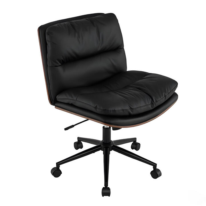 The armless design and spacious seat allow you to sit cross-legged, while the curved backrest supports your back for better relaxation. The high-quality gas lift and up & down lever ensure simple height adjustment. The sponge-padded backrest and seat have a soft comfortable feel. The chair swivels 360° to reach drawers, shelves, and side tables, and the gentle rocking motion brings extra comfort. Smooth faux leather is super easy to clean. The 5-claw base, gas lift and mechanism well support your weight and remain stable while in use. Furthermore, 5 rolling wheels make it easy to move around. BulletPoint: Curved Backrest and Wide Seat: The curved backrest hugs your spine for supportive support. The home office chair also has a 59cm(W) x 44cm(D) large seat, which makes it easy to sit cross-legged, tuck one knee up, or shift positions during long work or makeup sessions. Convenient Height Adjustment: The up & down adjustment lever and SGS certified gas lift offer controlled height adjustment. The adjustable seat height adapts to different desk heights and user preferences, keeping your feet grounded. Rocking Swivel Office Chair: The seat can rotate 360 degrees, allowing you to easily chat with friends from different directions. The 102°-120° rocking function of the cross legged chair adds a calming back-and-forth rhythm to relieve your fatigue. Enduring and Comfy Materials: Wooden panels of back and seat ensure strong and long-lasting support. The faux leather surface wipes clean after spills. Moreover, the elastic sponge and soft PP cotton fillings creates a relaxing sit that stays comfortable through busy mornings and long afternoons. High Stability and Easy Movement: 5-claw metal base spreads weight for outstanding stability. Additionally, 5 silent rolling casters provide smooth mobility for sliding in and out of your workspace or makeup area. The swivel vanity task chair can be used in the home office, study, bedroom, and more. Specification: Colour: Black/ White Material: Faux Leather, Sponge, Metal, Plywood Product Size: 70 x 60 x 85-93 cm (L x W x H) Seat Height: 56-64 cm Seat Width: 59 cm Seat Depth: 44 cm Backrest Height: 37 cm Weight Capacity:110 kg Net Weight: 15 kg Is Assembly Required: Yes PackageIncludes: 1 x Armless Office Chair 1 x Instruction Manual Box Qty: 1 (May vary by batch)