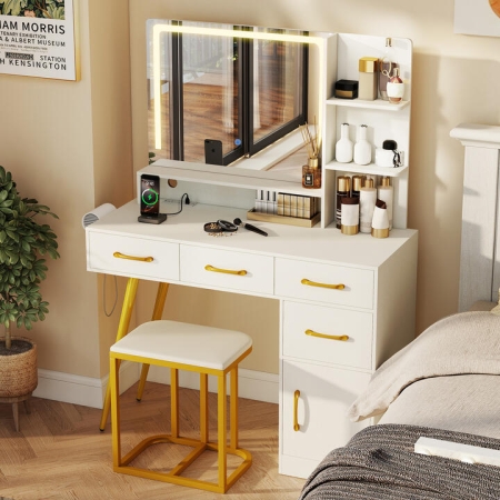 Large vanity mirror enables you to clearly see your face. The touch control lets you change 3 light modes and adjust brightness for a customized makeup experience. 1 storage cabinet, 3 open shelves, and 4 drawers keep your sundries neatly organized. Moreover, the charging station and hair dryer rack bring more convenience. The included stool features a plush seat cushion for optimal comfort. The robust metal frame and high-quality panels allow for excellent durability and sturdiness. Anti-toppling design and anti-slip foot pads ensure higher security and steadiness. Large Mirror with Light: The vanity mirror provides a spacious reflection area, which ensures a flawless view. It is also surrounded by adjustable LED light. You can easily switch between 3 lighting modes and control brightness through the touch control. Various Storage Options: 1 storage cabinet, 3 open shelves, and 4 drawers offer ample storage space to display or hide your cosmetics, skincare products, and beauty tools. Plus, the hair dryer rack keeps your hair dryer accessible. Note: The hair dryer rack can be mounted on either side according to your needs. Extra Charging Station: The additional charging station comes with different charging options, including 2 AC outlets (240V/10A), 1 USB port (5V/2.4A), and 1 Type-C port (5V/2.4A). You can conveniently charge your phone, tablet, or other devices. Sturdy Construction: The wooden panels and metal frame keep the vanity desk and stool stable. Anti-toppling design secures the dressing table to the wall to prevent tipping over. Moreover, anti-slip foot pads enhance overall steadiness and protect the floor from getting scratched. More Details of Vanity: Equipped with a soft padded seat cushion, the vanity stool offers comfy support during beauty routines. Smooth metal slides and drawer knobs also make it easy to open or close the drawers. Specification: Color: WhiteMaterial: Engineered Wood + MDF + Glass + Metal + PU Leather + SpongeProduct Dimensions of Vanity Desk: 100 x 40 x 137 cm (L x W x H)Product Dimensions of Stool: 39.5 x 29 x 44 cm (L x W x H)Size of Mirror: 68 x 50.5 cm(L x W)Tabletop Height: 75 cmWeight Capacity of Tabletop: 40 kgWeight Capacity of Stool: 150 kgAC Outlet: 240V/10AUSB Port: 5V/2.4AType-C Port: 5V/2.4ANet Weight: 38.5 kgBox QTY: 1(May vary by batch)Is Assembly Required: Yes Package Includes: 1 x Vanity Table1 x Stool1 x User Guide