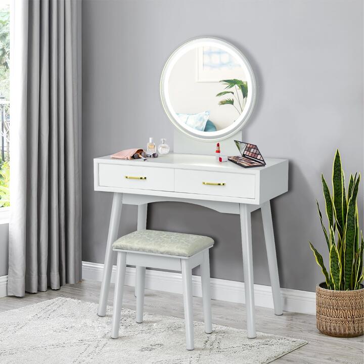 Enhance the look of your decor with our vanity table set! Designed in a simple but elegant style, our vanity set is an ideal solution of decorating your modern room. The two drawers with slim golden handle keeps a noble sense and meanwhile stores all your cosmetics, such as eyeshadow compact, eyebrow pencil, even makeup tools like nail polish, scissors, combs, etc. Sitting on our comfortable stool equipped with thick sponge, you would feel relaxed all the time. Why not embellish your bedroom and start a beautiful day? Bullet Point: Daily Dressing up for Your Beauty: To create a romantic atmosphere in your room, this elegant vanity set with rounded mirror and lights sets up a perfect makeup space, starting a chic day. Decorative pattern on stool with golden slim handle make it an unmissable gift for your beloved one. LED Tape Lights Surrounded Mirror: Three brightness of light can be adjusted to imitate lighting conditions in different occasions. The cold light is suitable for makeup in cold tone. Natural light is for daily dressing or going window-shopping while warm light is similar to restaurant light for a date. Perfect Space for Cosmetics: As the mirror is raised separately by a full-board support, it obviously extends tabletop space for a free makeup. Our vanity table set is also designed with two large storage drawers in the same size. You are sure to store all your cosmetics and skin care products. Everlasting Comfort: The fantastic vanity table surely matches up with an exquisite dressing stool for a delicate lifestyle. The stool features decorative leave pattern and skin-friendly fabric, adding elegance for your room. The thick cushion sponge is what reduce your fatigue after long time working. Accompany Your Life: Sitting on the stable stool, you can rest assured doing your makeup as it can hold up to 100 kg weight, with anti-slip foot pads for more safety. While the table top could bear 25 kg, easy holding all your cosmetics. Rubber wood is always considered for best stability and reliable safety. Specifications: Color: WhiteMaterial: MDF + Paint + Rubber WoodOverall Dimension: 80 x 40 x 132 cm (L x W x H)Stool Dimension: 36 x 27 x 44 cm (L x W x H)Drawer Dimension: 37 x 10 cm (L x W)Table Height to Ground: 75 cmMirror Diameter: 50 cmMirror Stand Board Length: 35 cmNet Weight: 20 kgMaximum Table Weight: 25 kgMaximum Stool Weight: 100 kg Box QTY: 1 Package Includes:1 x Vanity Table Set 1 x Instruction