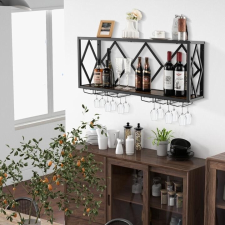Create a focal point with this contemporary wine rack table by displaying wine and a coffee maker. With built-in charging station, you can simultaneously charge multiple electric devices. Combining wine bottle rack, glasses holder and open storage shelves in one, the freestanding bar cabinet will meet your needs for storing wine bottles, glasses and other kitchen supplies. Worried about its stability? No need! The adjustable foot pads will keep it stable on uneven floors. In addition, the anti-tipping device will prevent it from tip-overs. Besides using it as a wine rack, it also works amazingly as a sideboard, coffee bar cabinet and more. Bullet Point: Built-in Charging Station: This wine rack table features 2 AC outlets (100V-240V/10A) and 2 USB ports (5V/2.1A), which can easily provide power for coffee machine, microwave, mobile phone etc. And the 149cm long power cord allows you to use it in various setups or locations. 3-Tier Open Storage Space: The floor liquor rack will be an ideal choice for wine lovers. 3-tier wine bottle rack can hold up to 21 wine bottles, and 4 rows of wine glass holder can hang up to 8 goblet glasses. With 3 open shelves, other liquors, glasses or cups will be well organized. Sturdy and Stable Construction: Constructed of 1.5cm thickened boards and heavy-duty metal tubes, the floor bar cabinet is sturdy yet durable. Adjustable foot pads ensure the wine rack stays stable on carpets or uneven floors. Moreover, the anti-tipping device adds overall stability. Multipurpose Wine Rack: There are endless possibilities with this accent storage home bar cabinet to maximize your space and bring you a clutter-free living environment. It is suitable to be used as a buffet sideboard, wine bar table cabinet, display or storage shelf. Easy Assembly and Cleaning: With labeled parts and clear step-by-step instructions, the freestanding wine rack table is fairly easy to put together. What’s more, any water stains can be easily wiped away with a damp cloth, saving you time and effort for daily cleaning. Features: Wine bottle rack can hold up to 21 wine bottles 4 rows of wine glass holder hang up to 8 glasses 2 AC outlets and 2 USB ports makes power at hand 149 cm power cord allows you to set it up anywhere 3 open shelves to store tableware, kitchen supplies Made of thickened board and sturdy metal tubes Stable with adjustable foot pads & anti-tipping device Versatile wine rack table for kitchen, dining room, etc. Easy to assemble with labeled parts and clear manual Specifications: Color: Rustic Brown/Rustic Grey + Black Material: Engineered Wood, Metal Overall Dimension: 120 x 40 x 92cm (L x W x H) Countertop Dimension: 120 x 40 cm (L x W) Net Weight: 20 kg Load Capacity of Countertop: 100 kg Load Capacity of Middle Shelf: 50 kg Load Capacity of Bottom Shelf: 40 kg AC Outlets: 100V-240V/10A USB Ports: 5V/2.1A Power Cord Length: 149cm Hold Capacity of Wine Racks: 21 bottles Hold Capacity of Wine Glass Racks: 8 glasses Package Includes: 1 x Wine Rack 1 x User Guide Box Qty:1(May vary by batch)