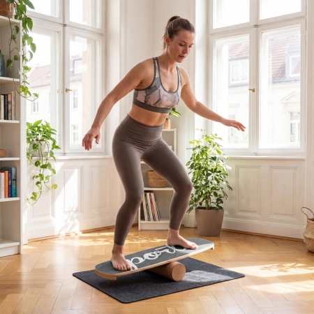 Our wooden wobble balance board measures 73 x 27 cm/29" x 11" (L x W), with a non-slip sandpaper surface for enhanced stability, allowing you to move with confidence while maintaining safety. Stoppers on both sides, a stabilized cork roller, and a felt mat protect floors and cushion every session, making it ideal for safe indoor use. Built with 12-ply pressed birch and 17 mm/0.7" thickness, this robust balance trainer resists snapping, warping, or squeaking even during intense routines, supporting up to 100 kg/220 lbs. Whether you want to build core strength, refine your coordination, or prepare for board sports like surfing or snowboarding, this versatile balance board ensures real functional training for athletes and fitness enthusiasts alike. Enhanced Stability & Safety: The balance board features non-slip sandpaper surface, providing secure footing and enhanced safety. Thus, you can confidently challenge yourself with dynamic movements without sacrificing safety. Superior Floor Protection: With stoppers on both sides, this wobble board prevents lateral slipping and cushions impact, while the stabilized cork roller ensures smooth, controlled motion. Plus, the felt mat included protects floors from scratches. Long-Lasting Durability: Crafted from 12-ply pressed birch wood and engineered for 17 mm/0.7" thickness, this robust balance trainer supports up to 100 kg/220 lbs. It refuses to snap, warp, or squeak, ensuring long-term performance. Core Performance Booster: This practical balance training board helps improve core strength, enhance coordination, promote better posture, develop focus and concentration. It ensures real results whether you want athletic finesse or a stronger, healthier body. Balance Training for Muti Sports: Designed to emulate board sports, this balance board trainer keeps you fit and ready for surfing, skateboarding, ice hockey, snowboarding, and more – so you can train for your favorite sport whenever and wherever. Specification: Color: Black+Natural/Green+NaturalMaterial: Plywood, Sandpaper, Cork, FeltProduct Dimensions: 73 x 27 cm/29" x 11" (L x W)Size of the Cork Roller: 10 x 35 cm/4" x 14" (Dia. x H)Weight Capacity: 100 kg/220 lbsNet Weight: 3,5 kg/7.5 lbsBox QTY: 1(May vary by batch)Is Assembly Required: Yes Package Includes: 1 x Balance Trainer Board1 x Cork Roller