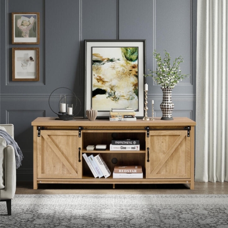 Want both a TV tray and a cabinet? The TV stand for 65” television is designed to achieve this. Made of safe and environmental chipboard, this TV table is durable and beautiful. Because of the high-quality material, this TV ark is easy to clean and maintain. Except for that, featuring a stable structure with large weight capacity and ample storage space with two open center compartments and two cabinets, this TV stand will definitely give you better-using experience. It is worth mentioning that this TV cabinet adopts a sliding barn door design, which allows you to adjust the door position according to your own needs, but also adds an aesthetic feeling of this TV ark. Bullet Point: Fits up to 65” TVs: Equipped with a wide tabletop, two open center compartments and two cabinets, this TV cabinet offers ample storage space for you. For the spacious table top, it is perfect for placing a 65”TV, photo frames, plants, and other items you may have. Besides, the two open center compartments and two cabinets design offer extra space for you to store your belongings. Beautiful Appearance with Sliding Barn Doors: Not only does the sliding barn door design allow you to adjust the door position according to your own needs, but also adds an aesthetic feeling of this TV ark. Other than that, this TV ark has clear wood grain, which is beautiful and suitable to any decor of your bedrooms or living rooms. High-Quality Wood Material: Made of melamine decorative laminate, the top board has good toughness and is difficult to deform. In addition, the other boards are made of chipboard, which is durable and waterproof. Most importantly, these boards are produced according to P2 standard, which is totally safe and environmental. Stable Structure with Large Weight Capacity: Not only do the sideboards adopt a strong frame structure, but also two barn doors use frame structure, which ensures the stability and large weight capacity of the TV bench. As for top board, it can hold up to 50kg items. And for sideboard, it can hold up to 20kg items. Easy to Clean and Maintain: Because of the high-quality material, this television stand is dustproof and wear-resistant, which makes it easy to maintain. At the same time, the television table is easy to clean. Even though it is stained, you can just wipe it with a cloth and it will be clean again. Features: Made of high-quality chipboard, wear-resistant and difficult to deform Sliding barn door design, beautiful and practical Conform to P2 standard, safe and environmental Stable structure with a large weight capacity Ample storage space with two open center compartments and two cabinets Natural and beautiful appearance with clear wood grain Ideal for 65” television, perfectly fit your bedrooms, living rooms and other furniture Easy to maintain and clean Specifications: Color: White/Grey Material: Melamine decorative laminate + ghipboard Overall dimension: 147 cm x 40 cm x 60 cm ( L x W x H ) Net weight: 32kg Weight capacity: 50kg Package includes: 1 X TV stand 1 X User guide Box Qty:1(May vary by batch) Is Assembly Required: Yes