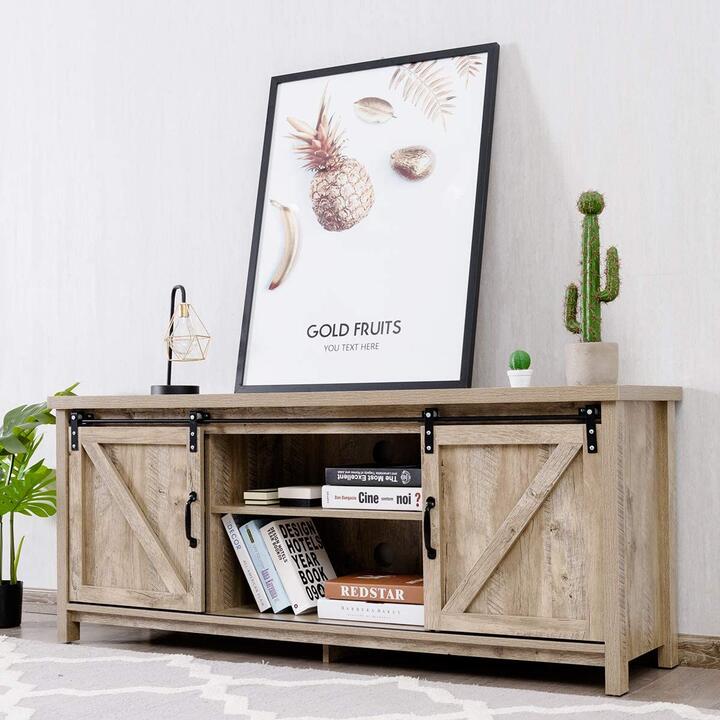Want both a TV tray and a cabinet? The TV stand for 65” television is designed to achieve this. Made of safe and environmental chipboard, this TV table is durable and beautiful. Because of the high-quality material, this TV ark is easy to clean and maintain. Except for that, featuring a stable structure with large weight capacity and ample storage space with two open center compartments and two cabinets, this TV stand will definitely give you better-using experience. It is worth mentioning that this TV cabinet adopts a sliding barn door design, which allows you to adjust the door position according to your own needs, but also adds an aesthetic feeling of this TV ark. Bullet Point: Fits up to 65” TVs: Equipped with a wide tabletop, two open center compartments and two cabinets, this TV cabinet offers ample storage space for you. For the spacious table top, it is perfect for placing a 65”TV, photo frames, plants, and other items you may have. Besides, the two open center compartments and two cabinets design offer extra space for you to store your belongings. Beautiful Appearance with Sliding Barn Doors: Not only does the sliding barn door design allow you to adjust the door position according to your own needs, but also adds an aesthetic feeling of this TV ark. Other than that, this TV ark has clear wood grain, which is beautiful and suitable to any decor of your bedrooms or living rooms. High-Quality Wood Material: Made of melamine decorative laminate, the top board has good toughness and is difficult to deform. In addition, the other boards are made of chipboard, which is durable and waterproof. Most importantly, these boards are produced according to P2 standard, which is totally safe and environmental. Stable Structure with Large Weight Capacity: Not only do the sideboards adopt a strong frame structure, but also two barn doors use frame structure, which ensures the stability and large weight capacity of the TV bench. As for top board, it can hold up to 50kg items. And for sideboard, it can hold up to 20kg items. Easy to Clean and Maintain: Because of the high-quality material, this television stand is dustproof and wear-resistant, which makes it easy to maintain. At the same time, the television table is easy to clean. Even though it is stained, you can just wipe it with a cloth and it will be clean again. Features: Made of high-quality chipboard, wear-resistant and difficult to deform Sliding barn door design, beautiful and practical Conform to P2 standard, safe and environmental Stable structure with a large weight capacity Ample storage space with two open center compartments and two cabinets Natural and beautiful appearance with clear wood grain Ideal for 65” television, perfectly fit your bedrooms, living rooms and other furniture Easy to maintain and clean Specifications: Color: Yellow/Grey Material: Melamine decorative laminate + ghipboard Overall dimension: 147 cm x 40 cm x 60 cm ( L x W x H ) Net weight: 32kg Weight capacity: 50kg Package includes: 1 X TV stand 1 X User guide Box Qty:1(May vary by batch)