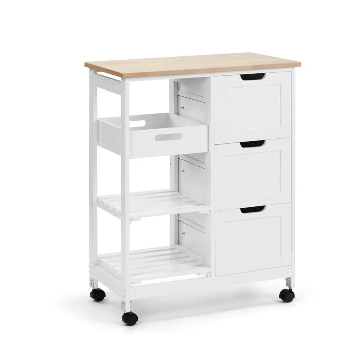 Want a practical and stylish storage solution? This trolley is perfect for your needs. Hanging racks for your stemware, a two door cabinet for cans and napkins, spacious shelves for snacks, and a tray top for getting everything prepared. Moreover, its shelves enhanced with a stemware rack and wine bottle rack, provide secure storage for glasses and wine bottles, Features, Made from medium density fiberboard and rubberwood top, Features 3x drawers for cans, napkins and other home essentials, Offers 3x tray to display other kitchen needs, Top can be used for an extra storage in your dining room, Built with 4x castor wheels for a convenient transport, Dimensions, 67W x 37D x 84H cm, Dispatch Timing, Normally dispatched within 3 business days, Notes, This item is applicable for 7-Days change of mind policy only. Note:- Actual product colours may vary due to lighting, studio photography, room conditions, different screens on various devices. – All our furniture product are flat pack (assembly required) for safe handling purposes.