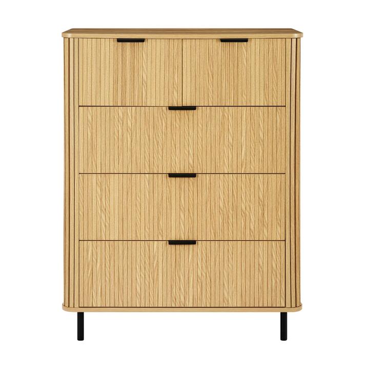 Keep your space stylish and organized with the Tallboy Chest of 5 Drawers—perfect for bedrooms, walk-in robes, or compact living areas. Designed with clean lines and fluted drawer fronts, it adds modern texture while maximizing vertical storage. Each of the five drawers glides smoothly on metal runners, offering ample room for folded clothes, accessories, or everyday essentials. Built from MDF and particleboard with sturdy metal legs, it delivers both form and function. For added safety, wall-mount anti-tip hardware is included to ensure stability in any home. Features:, Crafted from MDF and particleboard with a durable laminated finish for easy maintenance, Five generously sized drawers glide on smooth metal runners for effortless access and storage, Fluted front design adds visual interest and a modern, textured aesthetic, Metal legs and handles offer long-lasting support and complement the contemporary look, Anti-tip wall-mount hardware included for enhanced safety in family or high-traffic spaces, Dimensions, W 90 x D 46 x H 115 cm, Dispatch Timing, Normally dispatched within 3 business days, Notes. Note:- Actual product colours may vary due to lighting, studio photography, room conditions, different screens on various devices. – All our furniture product are flat pack (assembly required) for safe handling purposes.