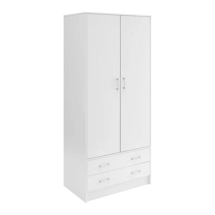 This stylish wardrobe offers a practical and elegant solution for organizing your clothing and accessories. With a combination of hanging space and drawers, it's designed to keep your wardrobe neat and accessible. This wardrobe clothes rack combines functionality with a contemporary look, offering the perfect solution for maintaining an organized and stylish space. Features:, Durable Construction: Built from a robust 15mm particleboard frame and 12mm particleboard interior, ensuring stability and longevity for daily use. Easy Access: Two hinged doors equipped with sturdy metal hinges provide convenient access to the tall storage space, while magnetic catches ensure the doors close securely. Ample Hanging Space: A full-width hanging rail allows you to hang clothes, helping to keep them wrinkle-free and organized for easy access. Additional Storage Drawers: Two full-width pull-out drawers located below the hanging area provide extra storage for folded clothes, accessories, or other items. The smooth metal runners ensure quiet and effortless operation. Stylish Design: The sleek and modern aesthetic of this wardrobe complements various bedroom decors, making it a versatile addition to your home. Dimensions, W 80 x D 48 x H 180 cm, Dispatch Timing, Normally dispatched within 3 business days, Notes. Note:- Actual product colours may vary due to lighting, studio photography, room conditions, different screens on various devices. – All our furniture product are flat pack (assembly required) for safe handling purposes.
