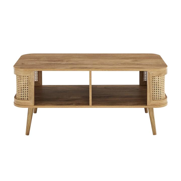 Introduce relaxed sophistication to your living room with the Oak/Rattan Open Shelves Coffee Table. Showcasing a natural oak-look finish and woven rattan detailing on the sides, this coffee table blends contemporary style with organic charm. The two open shelf compartments offer practical storage for books, magazines, or decorative pieces, keeping your space both stylish and organized. Built from durable MDF and particleboard with sturdy wooden legs, it's designed for everyday living. The combination of clean lines and natural textures makes this piece a standout in any modern or coastal-inspired interior. Features:, Crafted from MDF and particleboard with a smooth, oak-look laminated finish for durability and easy care, Woven rattan inlay on both ends brings texture and a relaxed, natural element to your space, Two spacious open shelves provide accessible storage for books, remotes, and décor, Sturdy wooden legs with PVC covering ensure a strong and stable foundation with a refined finish, Versatile design works beautifully in living rooms, lounges, or reading corners, Dimensions, W 110 x D 55 x H 49 cm, Dispatch Timing, Normally dispatched within 3 business days, Notes. Note:- Actual product colours may vary due to lighting, studio photography, room conditions, different screens on various devices. – All our furniture product are flat pack (assembly required) for safe handling purposes.
