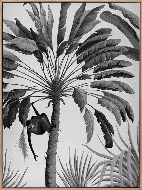 Dominica II Canvas Art Print: Part two of a monotone jungle inspired mural piece featuring dark grey palms, birds and monkeys on a pale grey backdrop. Designed to be displayed as a triptych with Dominica I & III. 2018 AUTUMN/WINTER COLLECTION: CONTINUUM Disclaimer: Colours of Urban Road products may vary due to device display differences, monitor settings, inherent product variations, lighting conditions, and screen calibration. While we strive for accuracy, slight variations may occur. For any concerns, contact our customer support. Your satisfaction is our priority. STRETCHED CANVAS Urban Road's stretched canvas fine art prints are professionally printed on polycotton artist canvas, using archival inks and then stretched and gallery wrapped. This means the image is stretched around a 38mm frame to create a seamless, museum-quality finish. All stretched and box framed art prints arrive ready to hang. SHADOW BOX FRAMES We also offer the option to add a shadow box frame to your Urban Road canvas art print. A little different from a traditional framed print, the canvas sits within the box frame with a 5mm gap, creating a sophisticated shadow effect between the frame and the canvas. Our solid timber box frame mouldings are 10mm wide, and 55mm deep, and add approximately 40mm to the length and height of the listed canvas size. ROLLED CANVAS ART At Urban Road, we also offer you the option to purchase your canvas art print unframed to allow you to have it framed your own way. As with our stretched and box framed canvas products, our rolled canvas prints are professionally printed on durable, museum-quality, matte coated polycotton canvas and made to order. Our rolled canvas products are printed to the listed stretched size, and come with an additional 45mm mirrored edge plus another 60mm white border to allow for gallery wrapping.