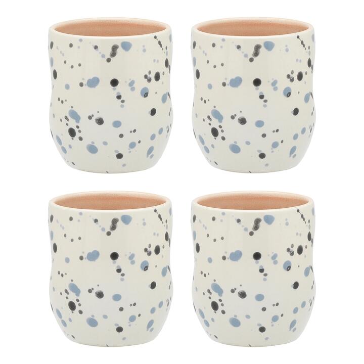 Sunset warmth radiates across Ecologys Dusk collection. The Ecology Dusk Set of 4 Cuddle Mugs 280ml are a high gloss, stoneware set of 4 cuddle mugs designed by Sarah Strickland, it features a warm haze of soft peach-pink tones washed across the inside of each piece. The organic shape is accentuated by fine edges, while the outer surface displays splattered ink-drops in a mix of moody blue hues against a milky white base..Features• Warm peach-pink tones wash across the inside of the mugs and splattered ink-drops in a mix of moody blue hues decorate the exterior• Hand Painted & Finished• This product features a reactive gloss glaze, variations in colour and design may occur• This Item is designed in Australia by Sarah Strickland• Made with premium StonewareWhat Am I Buying4 x Cuddle MugsMaterialsStonewareDimensions8cm x 8cm x 9cm