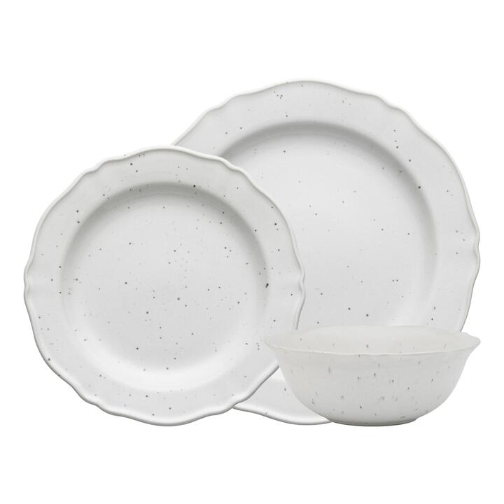 Designed by Megan McNeill, Ecologys Eve collection offers a subtle nod to modern farmhouse style. With its raised, decorative edge, the Ecology Eve 12 Piece Dinner Set showcases a unique, earthy-toned speckle across a cloudy white base. Made of stoneware and with a high gloss finish, this dinnerware series brings elevated elegance to every day dining. Features• Unique Scalloped Shape• Hand Finished• Designed by Megan McNeill• Made with premium stoneware• This set includes 4 x Dinner Plates, 4 x Dinner Bowls, and 4 x Side PlatesWhat Am I Buying• 4 x Dinner Bowls• 4 x Dinner Plates• 4 x Side PlatesMaterialsStonewareDimensions28.2cm x 28.3cm x 29.2cm