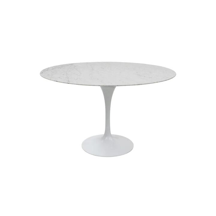 This authentic replica of renowned industrial Finnish designer, Eero Saarinen, is one of the true marvels of mid-century Skandinavian furniture that resolves the “ugly, confusing, unrestful world” beneath the table. Authentic Eero Saarinen replica dining table, White Italian Carrara Marble tabletop, Sophisticated Skandinavian design, Heavy moulded aluminium base with powder-coated matte finish, Introduce a true modern classic to your dining space with the Eero Saarinen Round Tulip Dining Table in Marble Replica that is a defining accomplishment of modern design. Italian Carrara Marble, This pure marble, extracted in Carrara, a city in the Italian province of Tuscany, is widely regarded as the finest in the world. It is steeped in heritage and an essential material in European design that elevates the interior of any dining room. An elegant use of space, The curved, heavy aluminium base of this dining table frees the space beneath it to allow for more leg room and freedom of movement at meal times and the flowing, natural lines soften any space. About the designer, Eero Saarinen is a renowned Finnish architect and industrial designer who's furniture pieces soared in popularity in the 1940s and 50s and have remained in high demand for over 60 years. Make no mistake, this is an iconic, timeless piece. Dimension: D 120 x L 72cm. Note:- Actual product colours may vary due to lighting, studio photography, room conditions, different screens on various devices. – All our furniture product are flat pack (assembly required) for safe handling purposes.