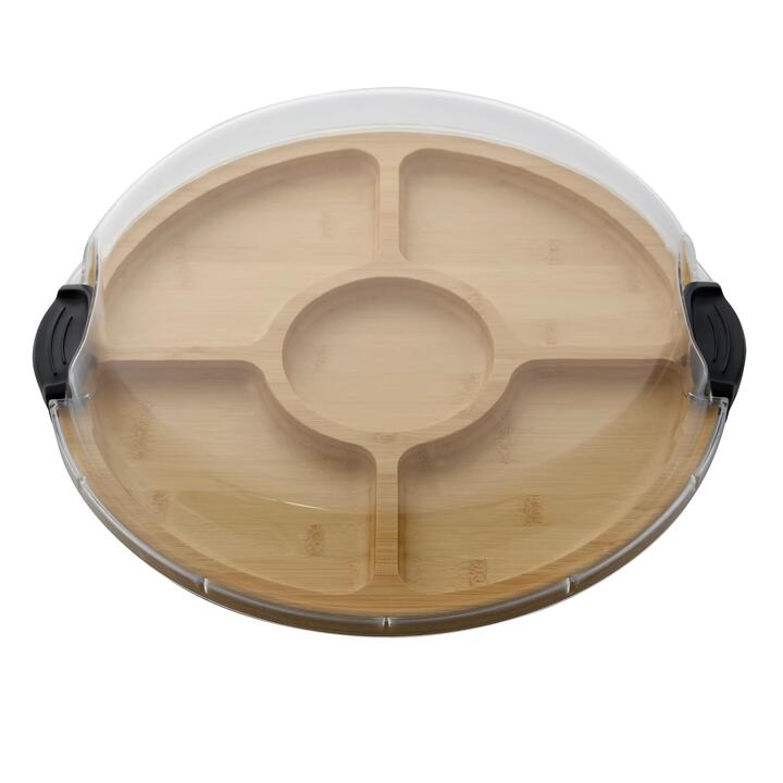 Snack time just got a major upgrade! The durable Farberware Build A Board Bamboo Round Section Board 35cmhas 5 handy compartments- a section in the centre for dips and sauces is here to take your meal prep, serving, and snacking to the next level. Whether hosting a brunch, packing a picnic, or keeping your kitchen chic, this platter keeps things fresh, tidy, and oh-so-stylish. Its sleek design also has a card insert slot, so you can easily label your creations, and the eco-friendly bamboo vibe makes it perfect for any occasion—indoors or out. So go ahead, make every meal a little e more fabulous. Features• GRAZING BOARD-TO-GO- Meet the snack genius you never knew you needed. This board has 5 compartments and a centre for dips, making grabbing a bite on the go super simple. The locking lids keep everything fresh and in place, and the clear lid helps you pick the right snack. Great for picnics, parties, or whenever hunger strikes• CUSTOMISABLE & PORTABLE- Create your perfect board on the go! From charcuterie to antipasti or a delightful breakfast board for a lazy weekend, the skys the limit• EASY SNAP LOCK- This board has secure locking handles for easy transportation• FEATURES- It is 35.5cm round, has an easy-snap locking system, is dishwasher and fridge-safe, and has a 2-year guarantee for added convenience• BPA-FREE- Build-a-Board is BPA-free, so you can snack with peace of mind, knowing it's safe and healthyMaterialsBamboo, PlasticDimensions43cm x 43cm x 8cm