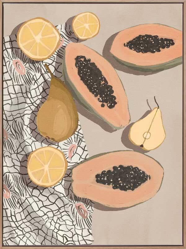 Fruta de bomba Canvas Art Print – Bring all the tropical, warm-weather energy to your space with this gorgeous still life of freshly sliced papaya fruit, pears, and juicy lemons. A mellowed-out palette featuring softened warm pink, yellow, green, white and clay shades gives this piece a calm, laidback feel. Perfect for adding a pop of colour to your space in a subtle way. Inspired by everyday life and rich cultures of Latin America, the Bonita Collection celebrates women, their strength and beauty. The vibrancy of their tribal heritage translates here in beautiful headwear and frilled, billowing dresses whilst balancing tropical fruit baskets effortlessly. The colour palette features warm and soft papaya pink, sun kissed banana yellow and tangerine offset by a pop of palm leaf green and sienna red. Disclaimer: Colours of Urban Road products may vary due to device display differences, monitor settings, inherent product variations, lighting conditions, and screen calibration. While we strive for accuracy, slight variations may occur. For any concerns, contact our customer support. Your satisfaction is our priority. STRETCHED CANVAS Urban Road's stretched canvas fine art prints are professionally printed on polycotton artist canvas, using archival inks and then stretched and gallery wrapped. This means the image is stretched around a 38mm frame to create a seamless, museum-quality finish. All stretched and box framed art prints arrive ready to hang. SHADOW BOX FRAMES We also offer the option to add a shadow box frame to your Urban Road canvas art print. A little different from a traditional framed print, the canvas sits within the box frame with a 5mm gap, creating a sophisticated shadow effect between the frame and the canvas. Our solid timber box frame mouldings are 10mm wide, and 55mm deep, and add approximately 40mm to the length and height of the listed canvas size. ROLLED CANVAS ART At Urban Road, we also offer you the option to purchase your canvas art print unframed to allow you to have it framed your own way. As with our stretched and box framed canvas products, our rolled canvas prints are professionally printed on durable, museum-quality, matte coated polycotton canvas and made to order. Our rolled canvas products are printed to the listed stretched size, and come with an additional 45mm mirrored edge plus another 60mm white border to allow for gallery wrapping.