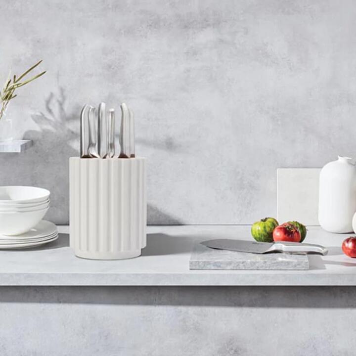 The Furi Radial Stone knife block has been artfully crafted to complement wooden and stone kitchen finishes and to be the centrepiece of your kitchen. Thoughtfully designed to securely store your knives and keep them in pristine condition. Universal slots allow you to organise the knives in the positions that suit you. Features • Good Design Award Winner. Modern block design constructed from natural materials including stone, cement and bamboo • Unrelenting sharpness Tech edge blades, hand-sharpened to 26° cutting angle and hardened to 55-57 HRC • Precision crafted X50CrMoV15 Japanese stainless steel blade for edge retention and rust resistance • Reverse-wedge, anti-fatigue handle designed to lock into the hand and reduce slip towards the blade • Optimised bolster fully protects fingers while allowing full use of the blade all the way to the heel • 25 Year Warranty What Am I Buying• East/West™ Santoku Knife 17cm • Cook's Knife 20cm • Carving Knife 20cm • Bread Knife 20cm • Utility Knife 15cm • Asian Utility Knife 12cm • Snow Terrazzo Radial Stone Block Materials Japanese stainless steel. Block stone, cement and bamboo