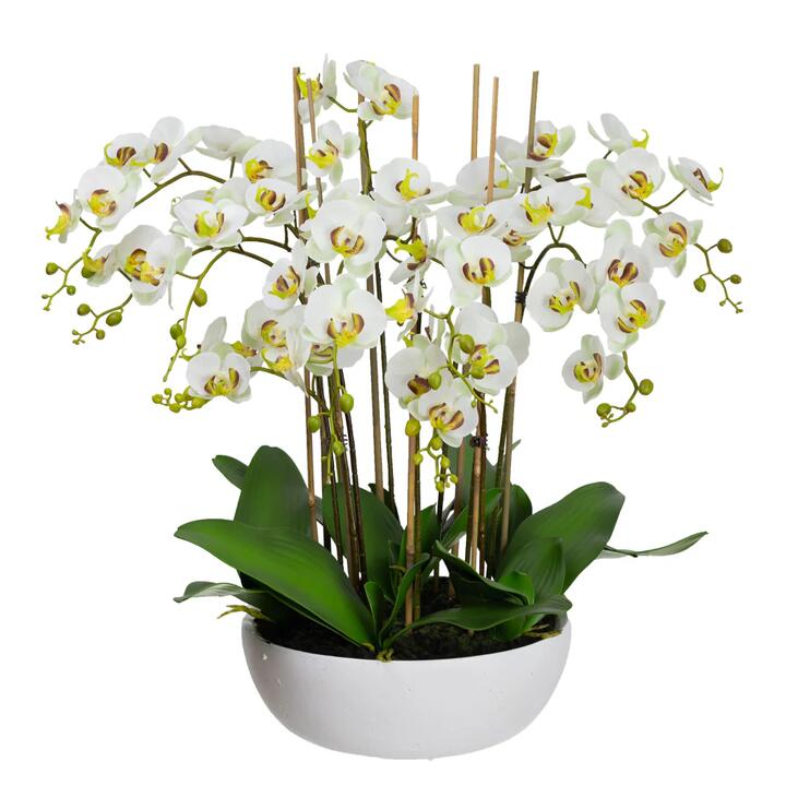 This artificial apple green phal orchid features pure white petals hovering above dark green leaves. Sporting an elegant look, this ornament will bring color and life to your home or office space. With its design, you can settle this piece on your built-in wall shelf alongside your picture frames, metal lantern, or tea lights for a dramatic statement. Features, Designed from a combination of quality materials such as plastic, polyester, cermic and wire to craft a long-lasting statement piece, Features realistic reproduction of a white orchid for a luxe touch, Arranged in a footed ceramic pot with a Moroccan-inspired design for added charm, Decorates your space with its vibrant tone to bring a touch of nature inside your room, Stabilised with faux soil in a stylish ceramic pot to make it more realistic style in your home, Dimensions, W 76 x D 80 x H 76 cm, Dispatch Timing, Normally dispatched within 3 business days, Notes. Note:- Actual product colours may vary due to lighting, studio photography, room conditions, different screens on various devices.