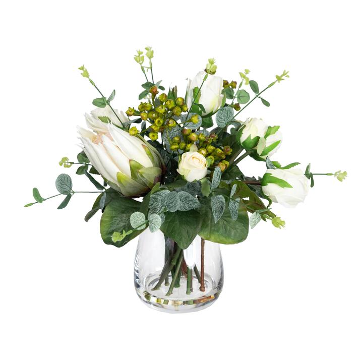 Add a splash of summer to any room using Protea & Broomcorn Mixed Arrangement. Its unique blooms of this artificial flower arrangement will instantly add a tropical feel and is perfect for contemporary and minimalist homes. Place as the centerpiece for a dining table or at the entryway for a summertime look that lasts year round. Features, Inspired by nature, silk flowers in bloom accent a backdrop of green leaves, Full of lush texture without the hassle of watering, trimming, or weeding, Made with a subtle dusty pink on its leaves and a multicolor flower, Adds an organic touch to your home, making it feel and look more cosy, Comes with a clear glass, Dimensions, W 45 x D 35 x H 40 cm, Dispatch Timing, Normally dispatched within 3 business days, Notes, This item is applicable for 7-Days change of mind policy only. Note:- Actual product colours may vary due to lighting, studio photography, room conditions, different screens on various devices.