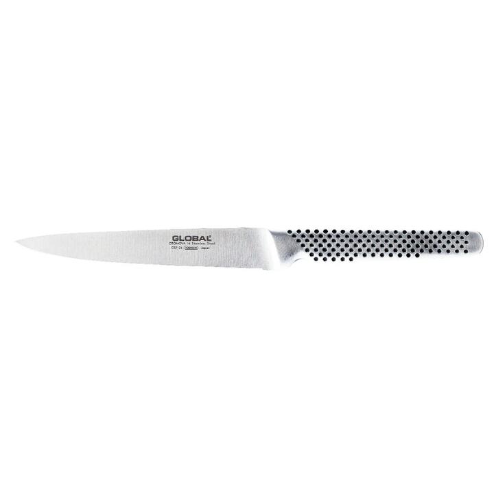 The versatile Global Classic 15cm Universal Knife excels at everyday tasks and is perfect for small tasks where precise cuts are needed. Universal knives are sometimes called sandwich knives because they work well on almost everything that goes into a sandwich—from tomatoes, meats and cheeses. Use one of these for tasks where a chef's knife would simply be too cumbersome. The Classic 15cm Universal Knife is made from forged CROMOVA 18 stainless steel, specially developed by Global as it holds a razor-sharp edge and resists rust, stains and corrosion. Ice tempered and hardened to Rockwell C56-58, each knife is carefully weighted for optimum performance and balance. Other unique features include its smooth contours and seamless construction which eliminates food and dirt traps offering the ultimate in safety and hygiene. The acute 15-degree angle cutting edge provides unsurpassed performance and superior edge retention. Features• CROMOVA 18 stainless steel blade, edge retains razor sharpness and resists rust, stains and corrosion• Acute 15 Degree Cutting Edge, provides unsurpassed performance and superior edge retention• Ice tempered and hardened to Rockwell C56-C58• Smooth contours and seamless construction eliminate food and dirt traps, offering the ultimate in safety and hygiene• Perfectly balanced handles precisely calibrated to offset the weight of the blade• Made in JapanMaterialsStainless SteelDimensions18cm x 9cm x 4cm