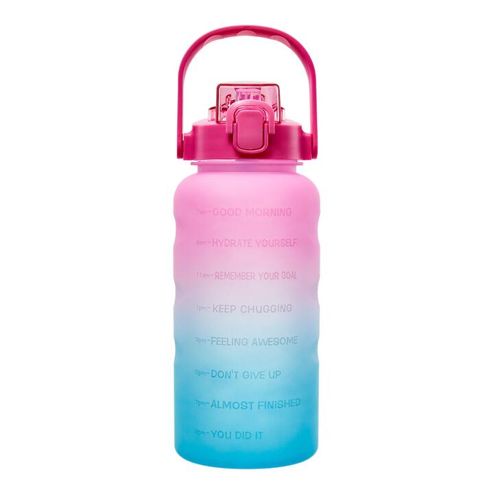 Breeze through your hydration goals with the inspiring, generously sized h2 hydro2 Jumbo Water Bottle 2LThere are no more excuses for not staying on top of your daily hydration goals thanks to the h2 hydro2 Jumbo Water Bottle 2L. With a generous 2 litre capacity, the Jumbo Water Bottle from h2 hydro2 holds the daily recommended water intake so you dont need to be going back and forth to the tap to ensure you stay hydrated throughout the day. Constructed from high-quality, non-toxic, BPA-free, food-grade plastic, the water bottle has convenient ml and oz measurement markings so you can track exactly how your progress is going. On the reverse side, the bottle offers inspiring quotes such as KEEP CHUGGING and ALMOST FINISHED at spaced-out intervals alongside different times throughout the day to ensure you reach your hydration goals. With a 100% leakproof safety-locked lid, you can sling the bottle in your bag and go hiking, travelling and camping without worrying about leaks. Alternatively, you can carry it by the sturdy handle and swing it along, taking a quick swig when you start feeling thirsty, through the easy-access flip lid straw. With a sleek, stylish body, the h2 hydro2 Jumbo Water Bottle 2L comes in a vivid ombre blue or purple colour that will look fantastic by your side. Features• Large 2L capacity holds all the water you need throughout the day• Features inspiring words to motivate you to keep drinking and reach your goals• Strong, ergonomic carry handle for effortless transportation• Non-toxic, BPA-free plastic construction can be reused again and again• Leak-proof lid with a safety lock and convenient flip lid straw• Track your water intake with the measurement markings in ml and oz• Beautiful blue or purple ombre colour makes the bottle a stylish accessoryDimensions11 x 30.5cm
