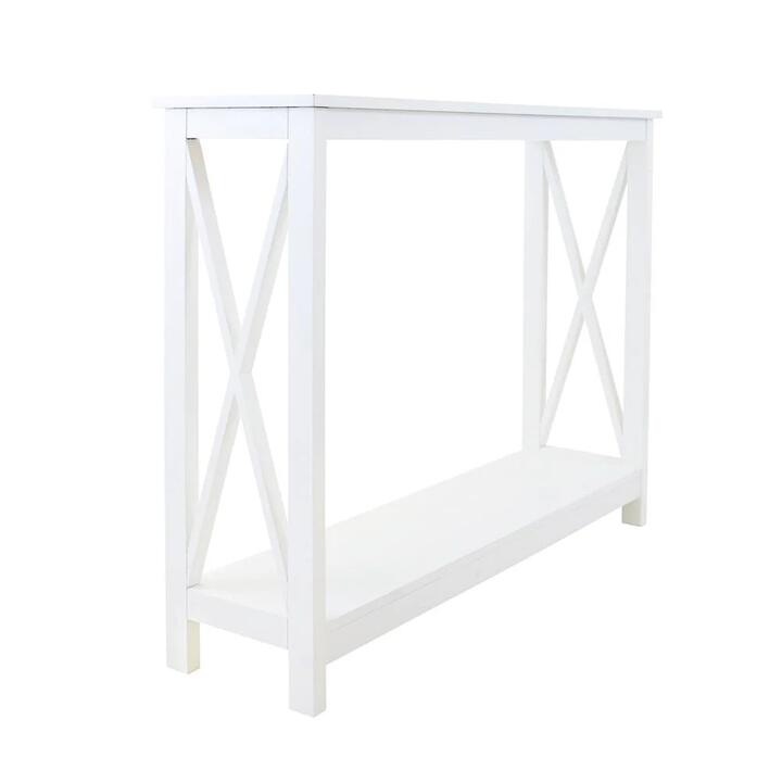 Product Description , Our Hailey Console table is a classic design and ample table top area. Also has 1 open shelf which will give your entry or giving room some storage space. it will complement any Décor. This console table is everyday classic design built of high quality of MDF with NC painted finish to be long lasting. Features, 1 Fixed Shelf, Spacious table top perfect for displays , Made of Medium Density Fiberboard (MDF), Matte White NC painted finish, Classic Table Top 15mm MDF, Dimensions, Overall Dimensions:, Width: 100cm, Depth: 30cm, Height: 80.2cm, Table Top Area:, Width: 100cm, Depth: 30cm, Height: 1.5cm, Internal Shelf Dimensions:, Width: 92cm, Depth: 26.5cm, Height: 63cm, Floor to bottom 1st shelf: Height: 6cm Colour: White Package Contents:, 1 x LI Console Table (with parts included for assembly), 1 x Instruction Manual & warranty. Note:- Actual product colours may vary due to lighting, studio photography, room conditions, different screens on various devices. – All our furniture product are flat pack (assembly required) for safe handling purposes.