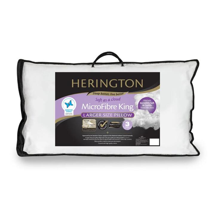 Designed for use on larger king sized beds, the Herington Microfibre Low Allergy Pillow King is 13% bigger than standard sized pillows for the perfect fit. This premium pillow has the ideal optimum profile for side and back sleepers, while offering an enhanced quality of sleep. Filled with 1600g of Ultra-fresh treated ExcelMicroFibre, the Herington Microfibre Low Allergy Pillow King imitates the soft feeling of a down pillow while boasting a high loft for maximum relaxation. Encased in a premium 100% cotton japara cover with stylish piped edges, the pillow is machine washable for effortless hygiene maintenance. Approved by the Sensitive Choice program of the National Asthma Council of Australia, the Herington Microfibre Low Allergy Pillow King is a great pillow option for those who suffer from asthma and allergies. Features King size pillow is 13% bigger for a perfect fit on larger beds- Down-like, Ultra-fresh treated 1600g Fibre microfibre fill- Medium profile and high loft is suitable for both side and back sleepers- Hypoallergenic and suitable for those suffering from asthma and allergies- Quality 100% cotton japara cover with tidy piped edges- Gentle machine washable for easy maintenance Dimensions 18 x 44 x 86cm Care Instructions Machine wash on gentle setting Returns Policy MyHouse's Change of Mind returns policy excludes the below products due to health and hygiene reasons: – Protectors- Quilts- Pillows- Underblankets- Toppers For more information on our change of mind policy, view our terms and conditions.