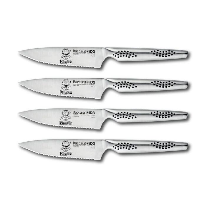 Commemorate a remarkable win and update your knife collection with the Baccarat iD3 4 Piece Steak Knife Set in the design Geelong Grand Final Glory. Boasting a Geelong Premiers 2022 design, this knife set is perfect for footy lovers and entertaining enthusiasts in your life. Crafted from premium grade Japanese Stainless Steel that has been expertly tempered to ensure strength and durability, the Baccarat iD3 Steak Knife Set is guaranteed to change the way you enjoy your steak. Ice hardened finely serrated blade edges help to provide a sharper, more precise cutting power while the ergonomically designed steel handles with patented iD3 microdots along the major pressure points fit comfortably in your handle to provide support and control while alleviating fatigue. Included in this set is 4 steak knives that are perfect for handling any cut of steak, chicken, lamb and more. Hand washing is recommended to maintain the quality of the blades over time. Please Note: Due to the customising process, please allow 2 weeks for delivery of your order. Features Boasts a Geelong Premiers 2022 Design Set includes 4 steak knives, ideal for handling any cut of steak, chicken, lamb and more Crafted from a single piece of premium quality Japanese Stainless Steel for enhanced durability Perfectly balanced and weighted for a comfortable and secure grip Patented iD3 microdots positioned along the handle at key pressure points help to relieve hand fatigue Hand washing recommended to maintain the quality of the blades Backed by the Baccarat Lifetime Guarantee