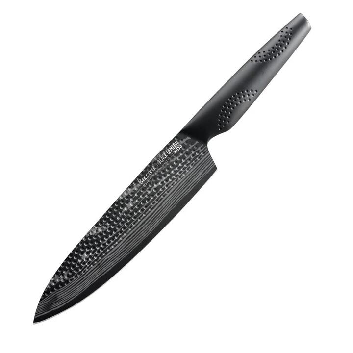 The Baccarat iD3 BLACK SAMURAI™ Chefs Knife 20cm is traditionally known as a cooks knife. It is an all-purpose knife that is curved to allow the Cook to rock the knife on the cutting board for a more precise cut. Effortlessly Slice & Dice with precision, makes it an essential for every kitchen. BRAND CREDENTIALSThe Baccarat iD3 BLACK SAMURAI™ knives are crafted from the finest Japanese Steel 420J2. The Japanese steel blade construction has been inspired by century old manufacturing techniques favored by traditional Japanese craftsman and SAMURAI sword makers, to create a super sharp cutting edge which holds a greater edge retention. The blades are ice-hardened ensuring superior blade strength and durability. The iD3 BLACK SAMURAI™ Japanese Steel has been mined in the same Japanese region of Chuo-Ku Chiba since the middle of the last century. Each knife in the iD3 BLACK SAMURAI™ range has been engineered and tested to meet Rockwell 53 specification guaranteeing the blades hardness, and optimum Performance. The Baccarat iD3 BLACK SAMURAI™ is believed to be a World 1st. The combination of Japanese Steel 420J2 with a matte black Antibacterial-ceramic coating. The knife is designed to be food-grade antibacterial, immune to acidic foods and stain resistant too. The Baccarat Trademarked MicroDot Technology is used exclusively on the iD3 range of knives. The MicroDot Technology is evident on the knives handle, and is used to comfort your hands main pressure points, ensuring complete control and precision when slicing. Backed by the Baccarat LIFETIME GUARANTEE. Features • The Baccarat iD3 BLACK SAMURAI™ Chefs Knife is an all-purpose knife for general tasks in the kitchen. This quintessential knife is useful for making classic cuts such as julienne, dice and fine chop and can be used for fruits, vegetables, meats and fish.• Baccarat iD3 BLACK SAMURAI™ knives are razor-thin and light weight making for an extremely fast, agile chopping and slicing experience• Every curve has been designed for precise performance without bruising or tearing delicate foods• The asymmetrical handle design of the Baccarat iD3 BLACK SAMURAI™ combined with the trademarked MicroDot Technology, provides more grip and safer knife control• Ice-hardened and Twice sharpened for superior cutting edge. Forged steel with one-piece seamless handle.• Antibacterial matte black ceramic coating. Blade angle 15-20°• Backed by the Baccarat LIFETIME GUARANTEE Dimensions • 20cm Material Japanese Steel