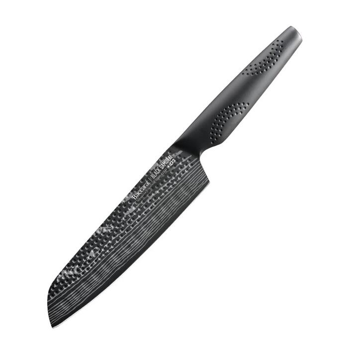 The Baccarat iD3 BLACK SAMURAI™ Santoku Knife 18cm is guaranteed to deliver you an agile chopping experience. The knifes low tip and broad blade makes it a cooks best friend for slicing, dicing and mincing. BRAND CREDENTIALSThe Baccarat iD3 BLACK SAMURAI™ knives are crafted from the finest Japanese Steel 420J2. The Japanese steel blade construction has been inspired by century old manufacturing techniques favored by traditional Japanese craftsman and SAMURAI sword makers, to create a super sharp cutting edge which holds a greater edge retention. The blades are ice-hardened ensuring superior blade strength and durability. The iD3 BLACK SAMURAI™ Japanese Steel has been mined in the same Japanese region of Chuo-Ku Chiba since the middle of the last century. Each knife in the iD3 BLACK SAMURAI™ range has been engineered and tested to meet Rockwell 53 specification guaranteeing the blades hardness, and optimum Performance. The Baccarat iD3 BLACK SAMURAI™ is believed to be a World 1st. The combination of Japanese Steel 420J2 with a matte black Antibacterial-ceramic coating. The knife is designed to be food-grade antibacterial, immune to acidic foods and stain resistant too. The Baccarat Trademarked MicroDot Technology is used exclusively on the iD3 range of knives. The MicroDot Technology is evident on the knives handle, and is used to comfort your hands main pressure points, ensuring complete control and precision when slicing. Backed by the Baccarat LIFETIME GUARANTEE. Features • The iD3 BLACK SAMURAI™ Santoku is #1 in the kitchen for Cutting, Slicing, Chopping, Dicing, Mincing and so much more. It is the Perfect knife when cutting meats, slicing cheeses, and chopping or dicing vegetables and nuts. The recessed scallops situated above the blade's edge assists to release thin slices and sticky food after slicing.• Baccarat iD3 BLACK SAMURAI™ knives are razor-thin and light weight making for an extremely fast, agile chopping and slicing experience• Every curve has been designed for precise performance without bruising or tearing delicate foods• The asymmetrical handle design of the Baccarat iD3 BLACK SAMURAI™ combined with the trademarked MicroDot Technology, provides more grip and safer knife control• Ice-hardened and Twice sharpened for superior cutting edge. Forged steel with one-piece seamless handle.• Antibacterial matte black ceramic coating. Blade angle 15-20°• Backed by the Baccarat LIFETIME GUARANTEE Dimensions • 18cm Material Japanese Steel