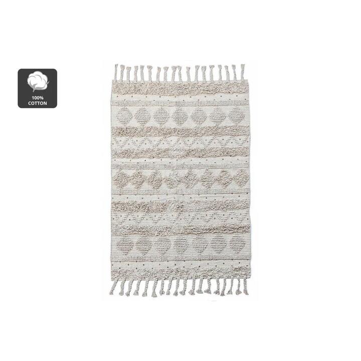 Introduce stunning textiles and design into your home with a soft and supple rug that will brighten any room and add time-honoured style. Patterned tassel rug, Middle-Eastern inspired design, Made from 100% cotton, Handwoven design, Dimensions: 120 × 180cm, Featuring a stunning geometric pattern that conjures the essence of a Moroccan marketplace, the Imlil Rug offers both style and function to your interior. Natural beauty, Handwoven from 100% cotton, this rug offers soft textiles for your toes and will endure in style for years to come thanks to its durable and low-maintenance properties. Traditional patterns, Featuring an entrancing geometric design with diamonds, tassels and rugged textures, this beautiful rug will bring a rustic quality to your decor and add light, neutral hues. Dimension: L 120 x W 180 cm. Note:- Actual product colours may vary due to lighting, studio photography, room conditions, different screens on various devices.