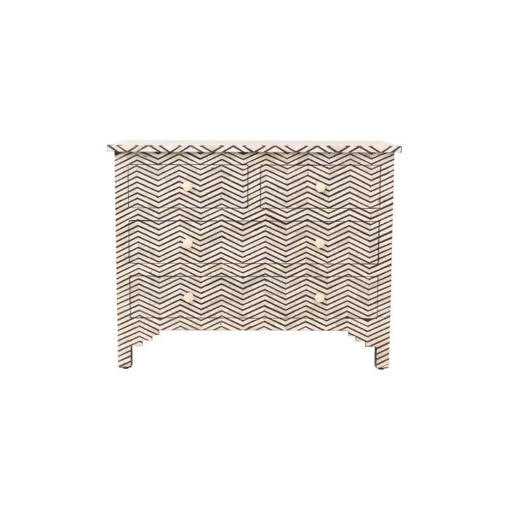 This is a bone inlay chest of drawers that has been filled with black resin. It is a very bold piece that will definitely catch your eye if you see it in a room. Note:- Actual product colours may vary due to lighting, studio photography, room conditions, different screens on various devices. – All our furniture product are flat pack (assembly required) for safe handling purposes.