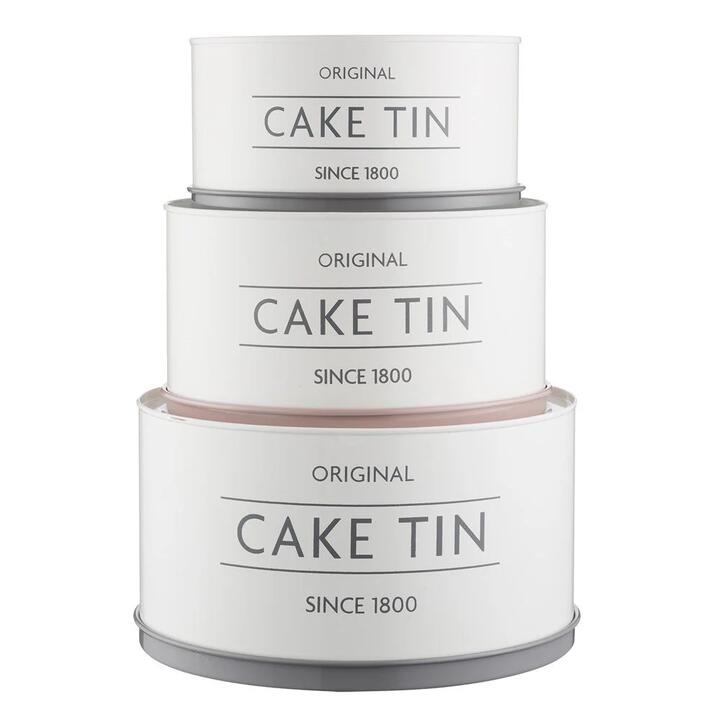 Store and serve delicious cakes and baked goodies in the Mason Cash Innovative Kitchen Cake Tin Set. Including 3 cake tins of varying size, the Mason Cash Innovative Kitchen set is made with coated steel and features a classically styled text design with coloured bases. Each lid creates a seal to keep contents fresh when stored or being transported and the tins nest when not in use for space saving storage. Features • 3-piece cake storage set• Store and serve cakes, biscuits, and treats of all sizes• Made with quality coated steel• Printed with simple label design• Tins stack and nest for space-saving storage• Wipe clean with damp cloth. Do not immerse in water Material Coated steel Dimensions Small Tin: 19cm, Medium Tin: 22cm, Large Tin: 25cm