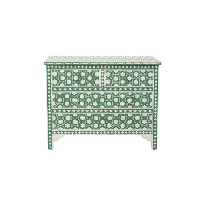 Bring timeless charm to your decor with a beautiful chest of drawers made with handcrafted bone inlay arranged into a traditional motif, and close away clutter in four spacious drawers. Beautiful bone inlay chest of drawers, Handcrafted, ethically sourced bone, 2 Upper drawers, 2 spacious lower drawers, Seamless ball-bearing sliders, Forest green resin, Anti-scratch floor stoppers, Make a statement in style with the Jasmine Bone Inlay Chest of Drawers that's perfect for storing away clothes, linen, crockery and so much more in the home, and can be dressed in your style with ornaments, plants and beyond. Meticulously handcrafted, Each piece of ethically sourced bone is lovingly handcrafted, paying homage to a time-honoured tradition, before being placed into a beautiful mosaic with forest green resin, highlighting the natural variants of the material and creating a truly unique design. Organised in an instant, Take advantage of two large lower drawers and two upper drawers that will let you store away your household items. With everything in its place, you'll enjoy a smooth-running, clutter free home. Dimension: D 108 x W 50 x H 86cm. Note:- Actual product colours may vary due to lighting, studio photography, room conditions, different screens on various devices. – All our furniture product are flat pack (assembly required) for safe handling purposes.