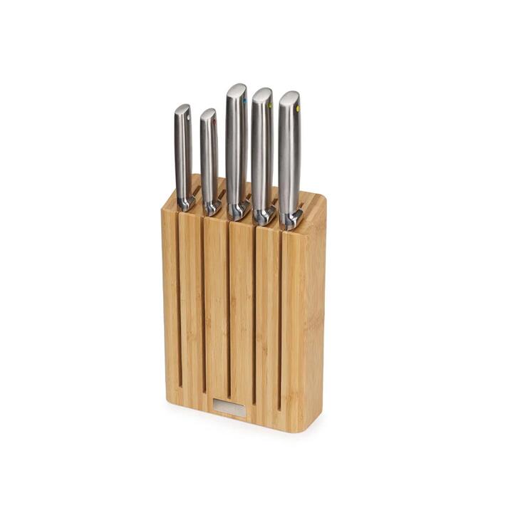 The Joseph Joseph Elevate Steel Knives Bamboo 5-Piece Knife Block Set is a culinary essential for precision and style. Crafted with precision from high-quality Japanese stainless steel, the set features five knives with ergonomic stainless steel handles, ensuring optimal balance and control. The innovative Elevate technology promotes hygiene and cleanliness by preventing the blades from touching surfaces when at rest. The weighted handles and integrated tool rests add convenience to your culinary journey. Store your knives in the chic slimline bamboo knife block with non-slip feet for a clutter-free kitchen. The Joseph Joseph Elevate Steel Knives Bamboo 5-Piece Knife Block Set includes a 9cm Paring knife, 11cm Serrated knife, 14cm Santoku knife, 20cm Chef's knife, and a 20cm Bread knife. Features High-quality Japanese stainless steel blades Ergonomic stainless steel handles for optimal control Elevate technology prevents blade contact with surfaces for improved hygiene Weighted handles and integrated rests enhance convenience Stylish bamboo knife block with non-slip feet for organised storage Set includes 9cm Paring, 11cm Serrated, 14cm Santoku, 20cm Chef's, and 20cm Bread knives Material Storage Block: Bamboo Knives: Stainless Steel Dimensions Storage Block: 6.1 x 35.5 x 14.9cm Paring knife: 9cm Serrated knife: 11cm Santoku knife: 14cm Chef's knife: 20cm Bread knife: 20cm What Am I Buying 1 x Storage Block 1 x Paring knife 1 x Serrated knife 1 x Santoku knife 1 x Chef's knife 1 x Bread knife