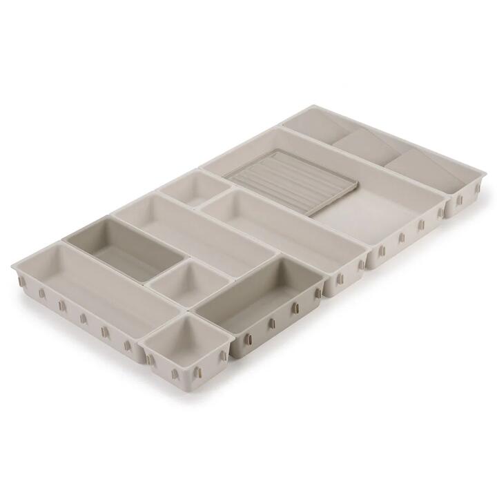 This modular design will turn makeup mayhem into cosmetics calm in no time. It comprises a set of individual trays of different sizes that can be clipped together on all sides, allowing you to arrange them in any order to fit your drawer space. To change the order, simply unclip each tray and rearrange as necessary. Perfect for organising and storing a wide range of beauty and grooming items including makeup, eyeliners, lip pencils, brushes, nail polishes, hair accessories and more. The set includes a tiered makeup brush holder, a pencil tray and self-adhesive, non-slip feet which can be applied once the final arrangement of trays has been decided. Features • Individual compartments clip easily together on all sides • Modular design can be customised to fit drawer space • Tiered makeup brush holder • Pencil tray for eyeliners, lip gloss and mascaras • Perfect for organising a wide range of beauty and grooming items including makeup, eyeliner pencils, brushes, nail polishes, hair accessories and more Dimensions 62 x 35.2 x 5cm Materials Plastic Care Instructions Wipe clean with a damp cloth.